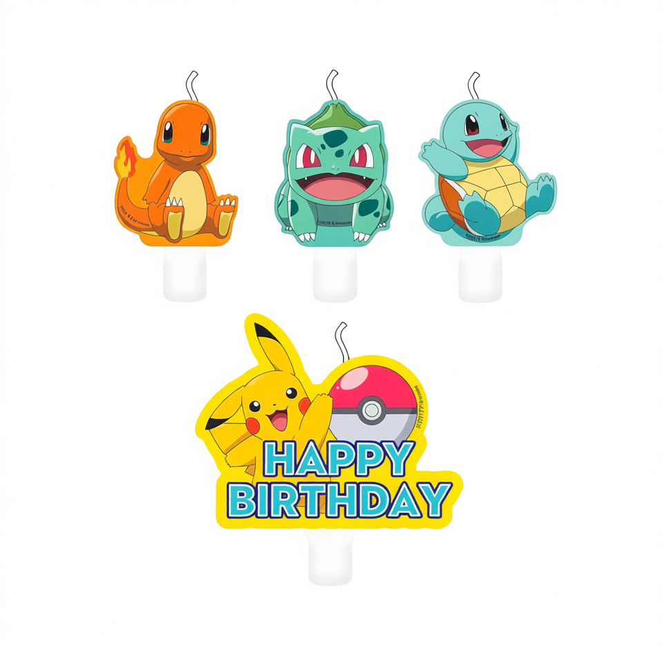 Bougies d'anniversaire Pokémon, lot de 4 pièces avec Pikachu, Charmander, Bulbasaur, Squirtle