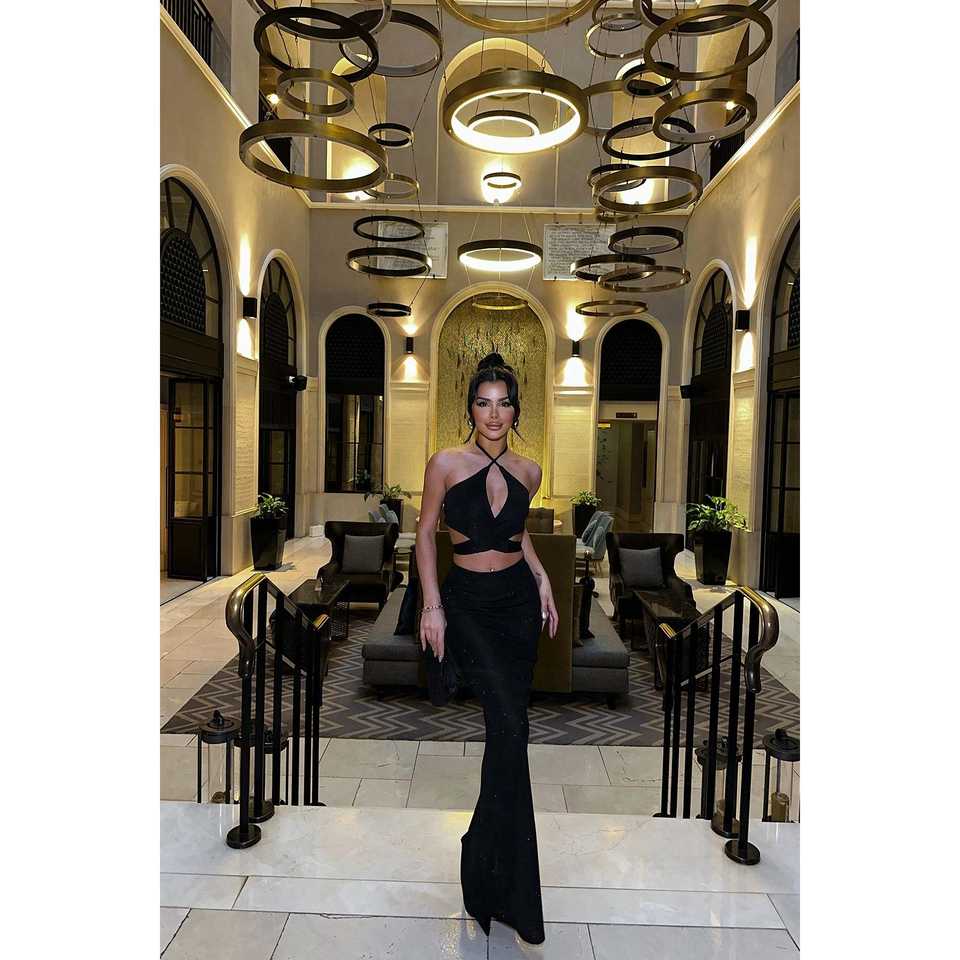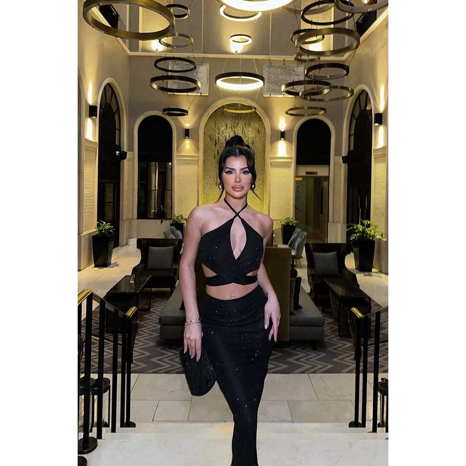 Ensemble jupe deux pièces Polina – Haut court rayé et uni de style club luxueux, taille 2XL, collection automne, coupe ajustée en maille