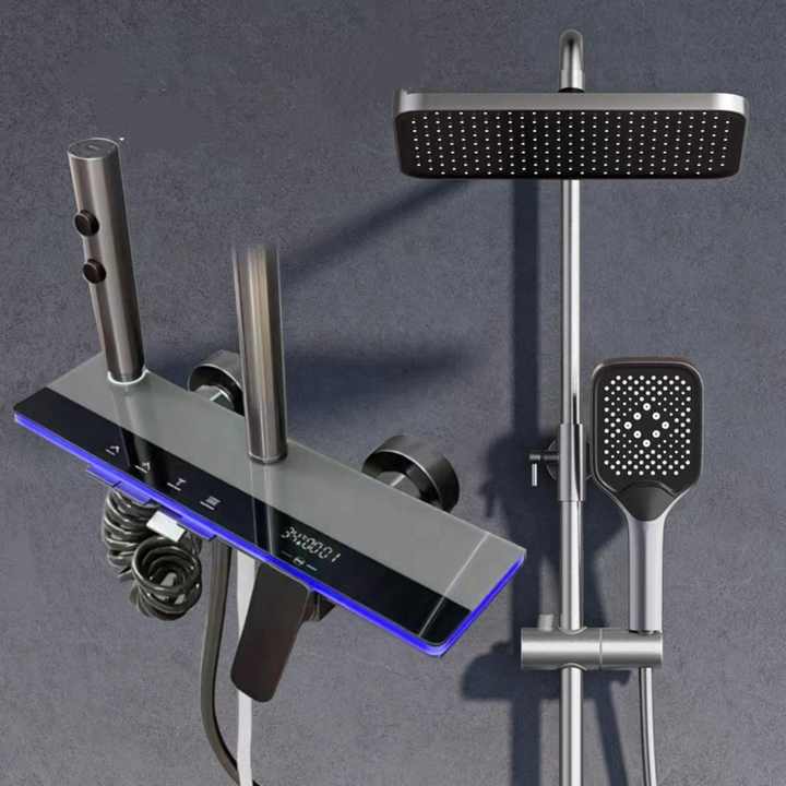 Ensemble de douche thermostatique à LED chromé poli, monté au plafond, avec affichage de la température, effet pluie et cascade, en laiton et céramique