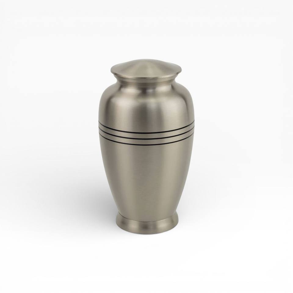 Ensemble d'urnes funéraires en laiton doré poli, disponible en plusieurs tailles, avec des lignes d'accentuation noires pour une collection commémorative complète