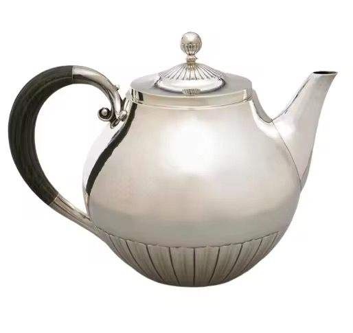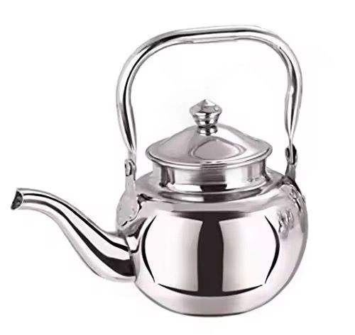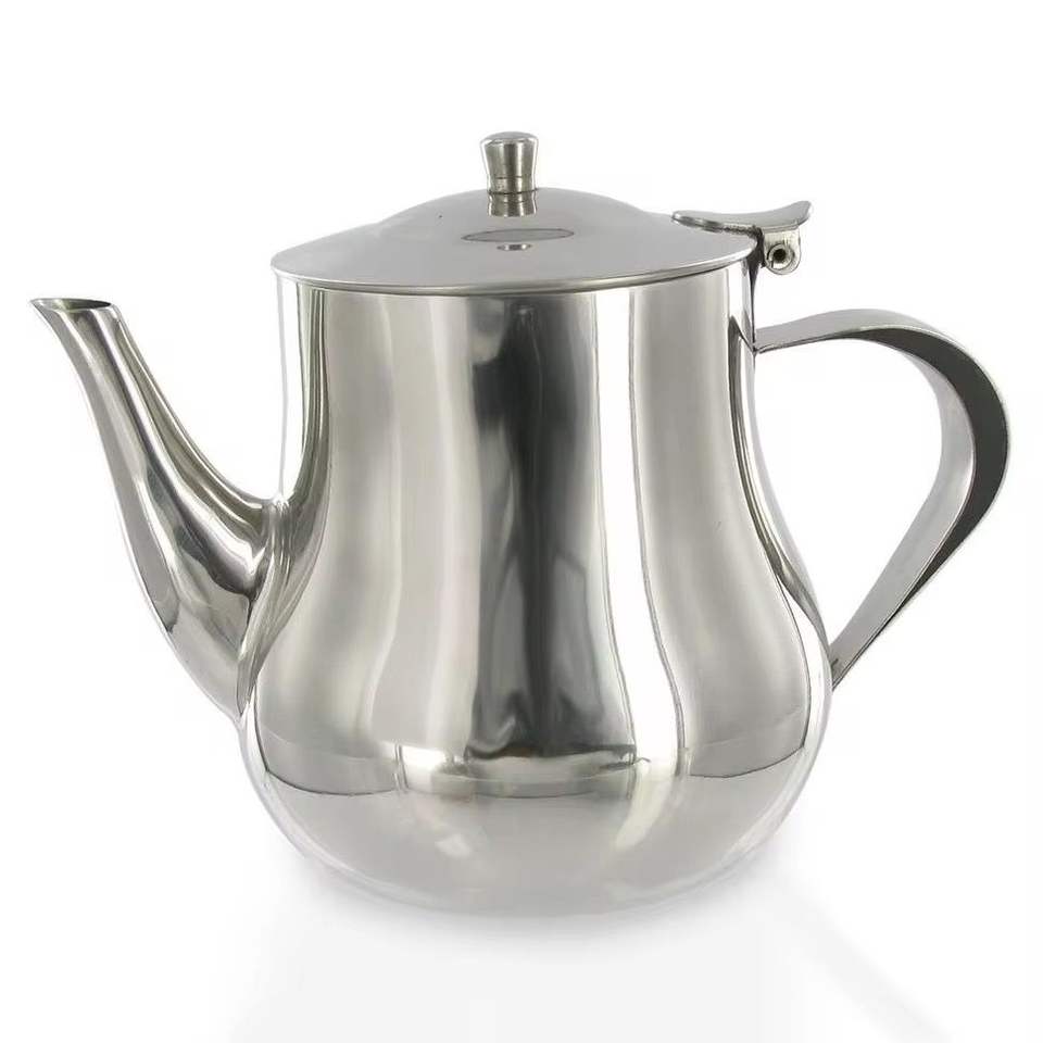 Théière en acier inoxydable poli, corps rond moderne, bec courbé, poignée ergonomique, ustensile de cuisine durable, pot élégant pour la préparation de thé à la maison