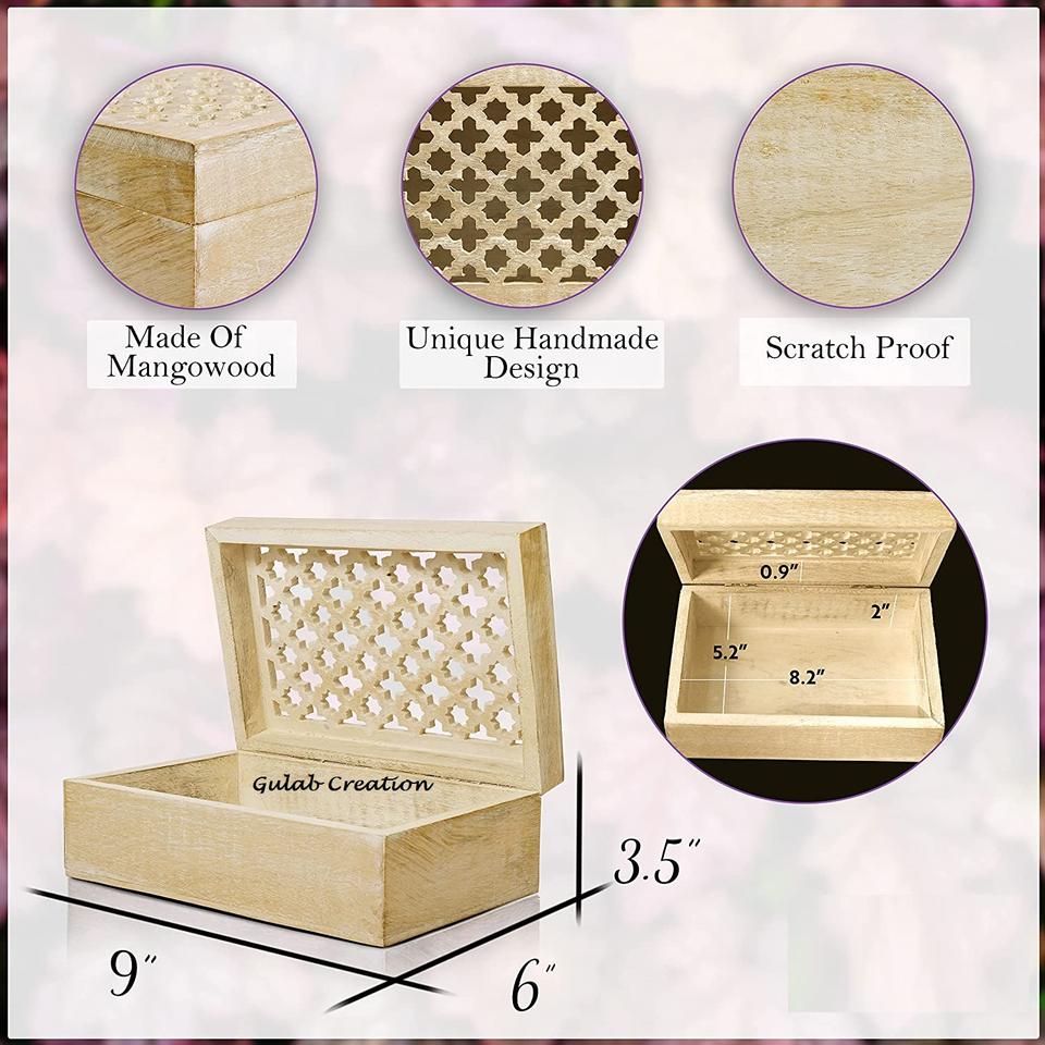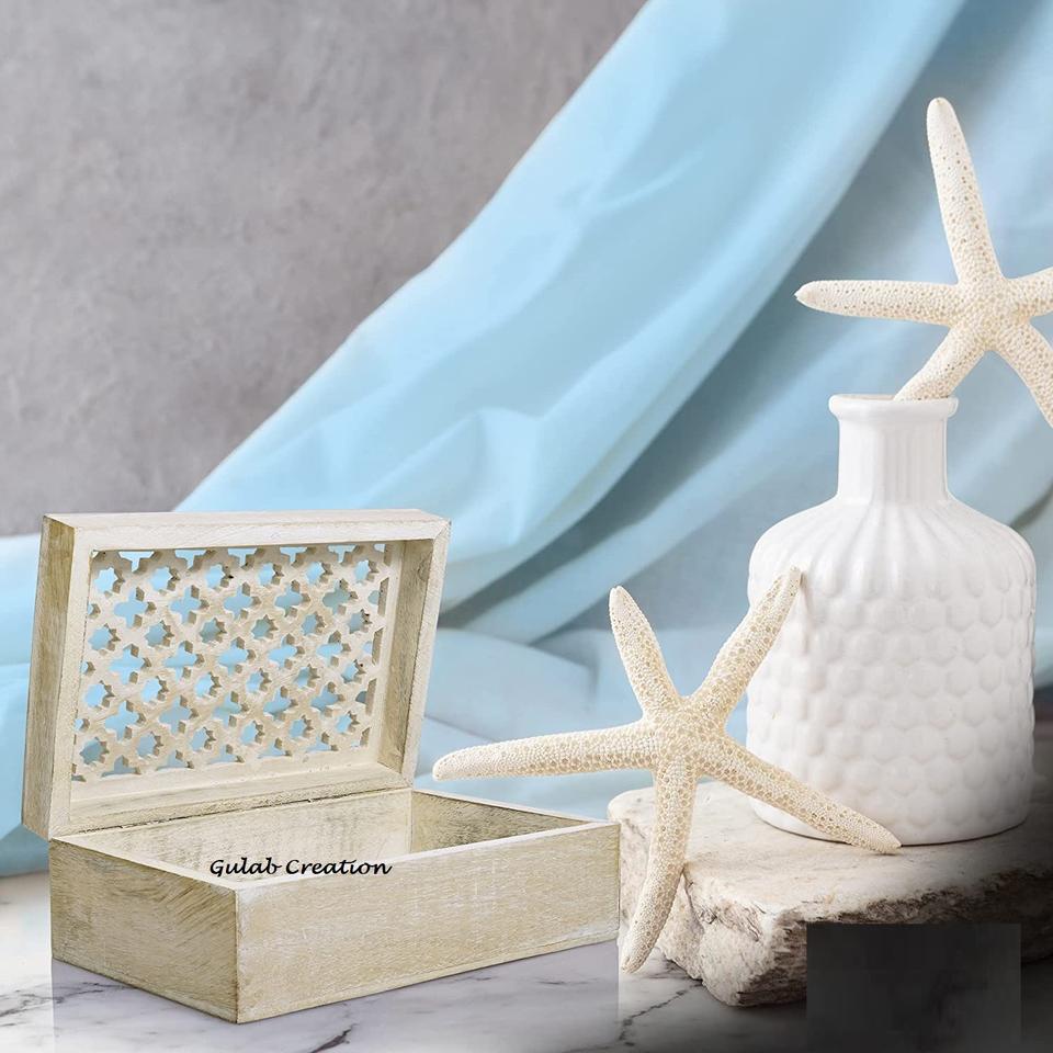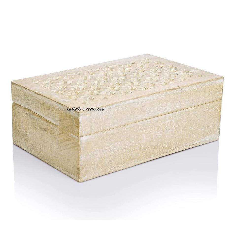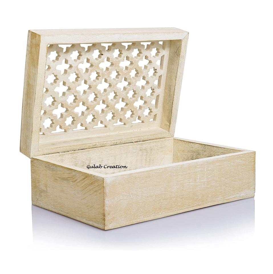 Boîte à souvenirs en treillis en bois blanchi à la chaux polie avec couvercle à charnière Boîte de décoration de rangement de bijoux en bois