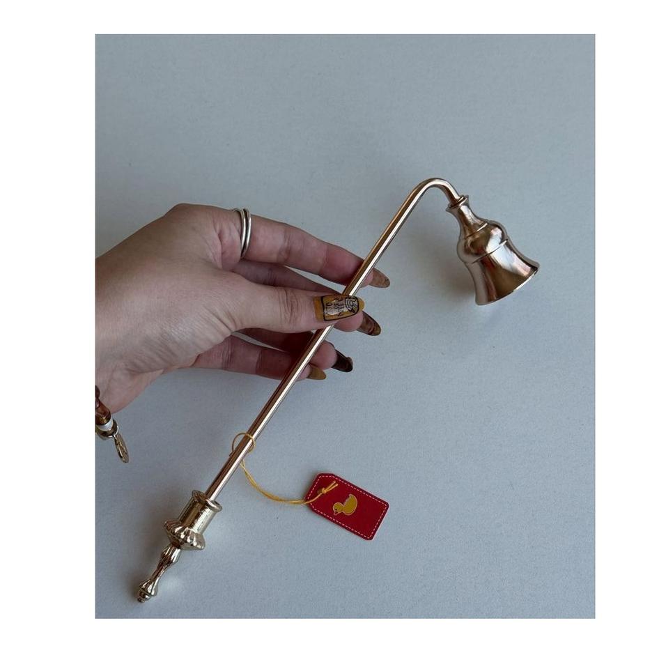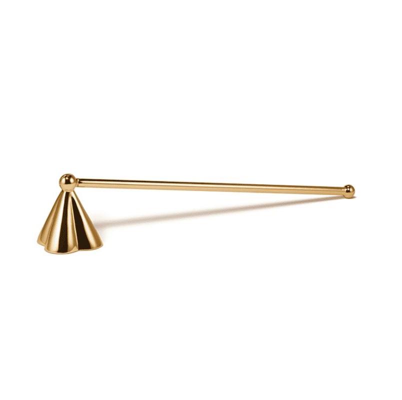 Polished metal candle snuffer providing controlled flame extinguishing while uplifting the decor mood in calm home areas