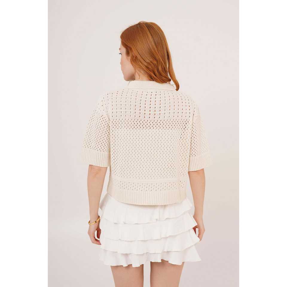 Chemisier en tricot ajouré à col polo pour femme, couleur écru, style décontracté et respirant pour tous les jours