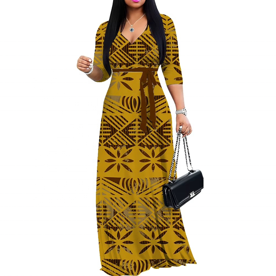 Robe longue élégante pour femme à col en V, motif tatouage polynésien samoan, rafraîchissement estival, mode Pasifika