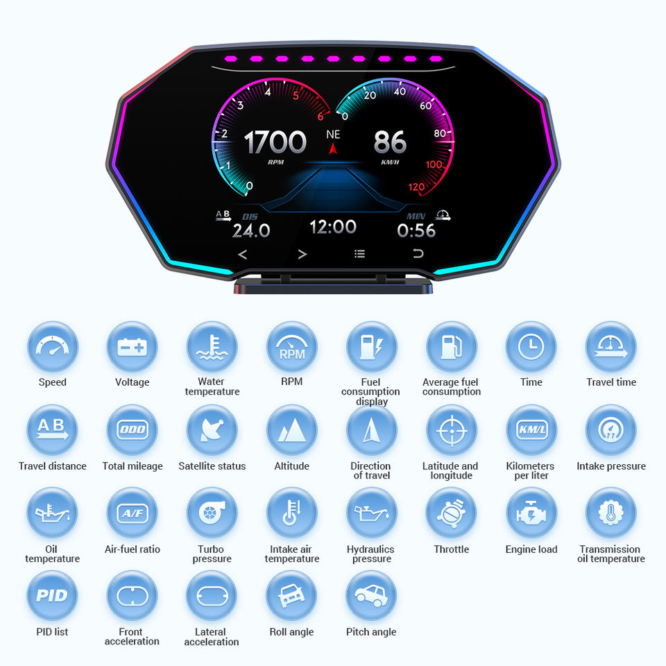 Distance de conduite, Surveillance de la vitesse, Moteur TR/MIN, Temps de conduite, Alarme de Conduite de Fatigue, Consommation de carburant, Alarme de tension, Multifonction