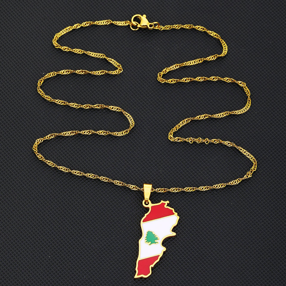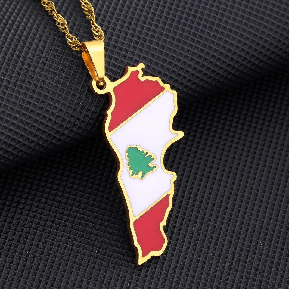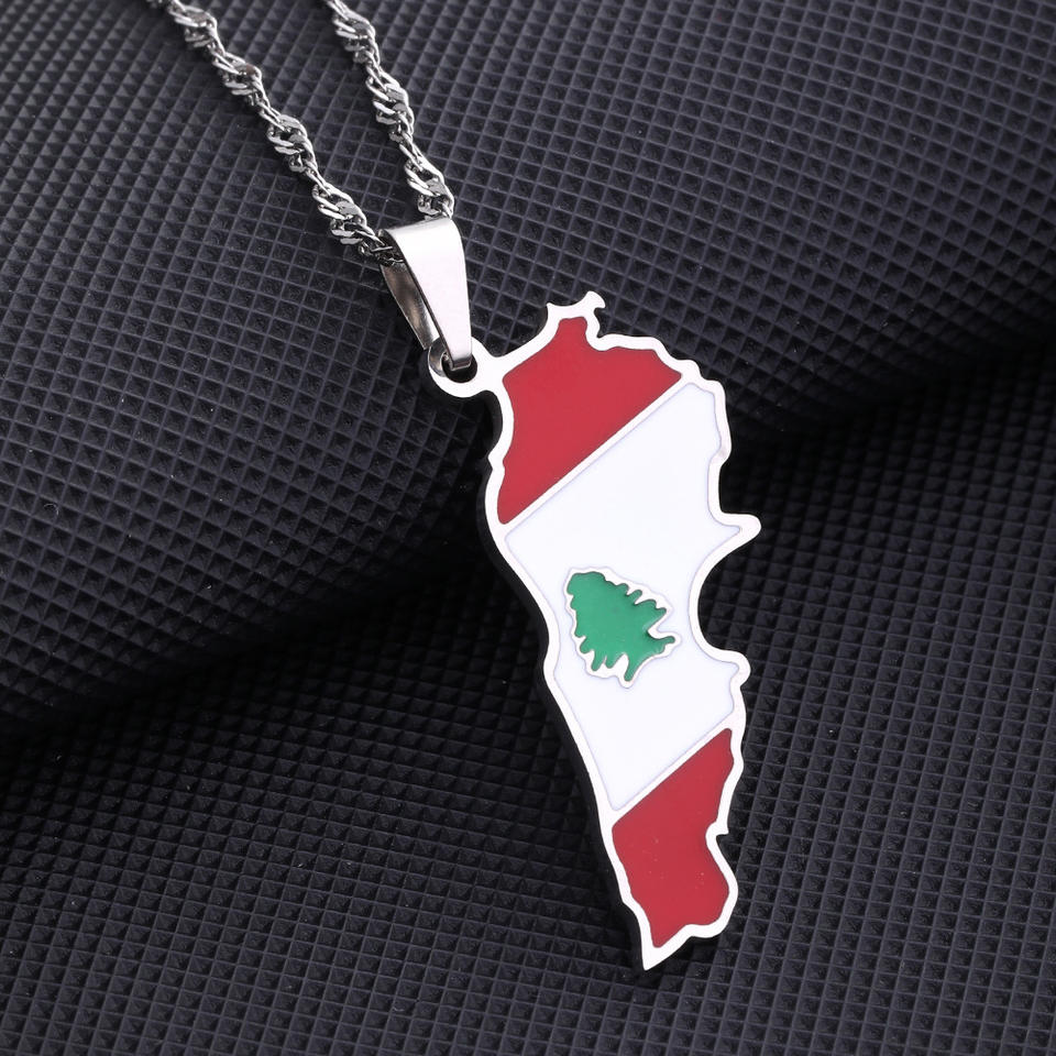 Collier populaire en acier inoxydable plaqué or et argent avec carte du Liban et arbre de cèdre, collier avec drapeau du Liban