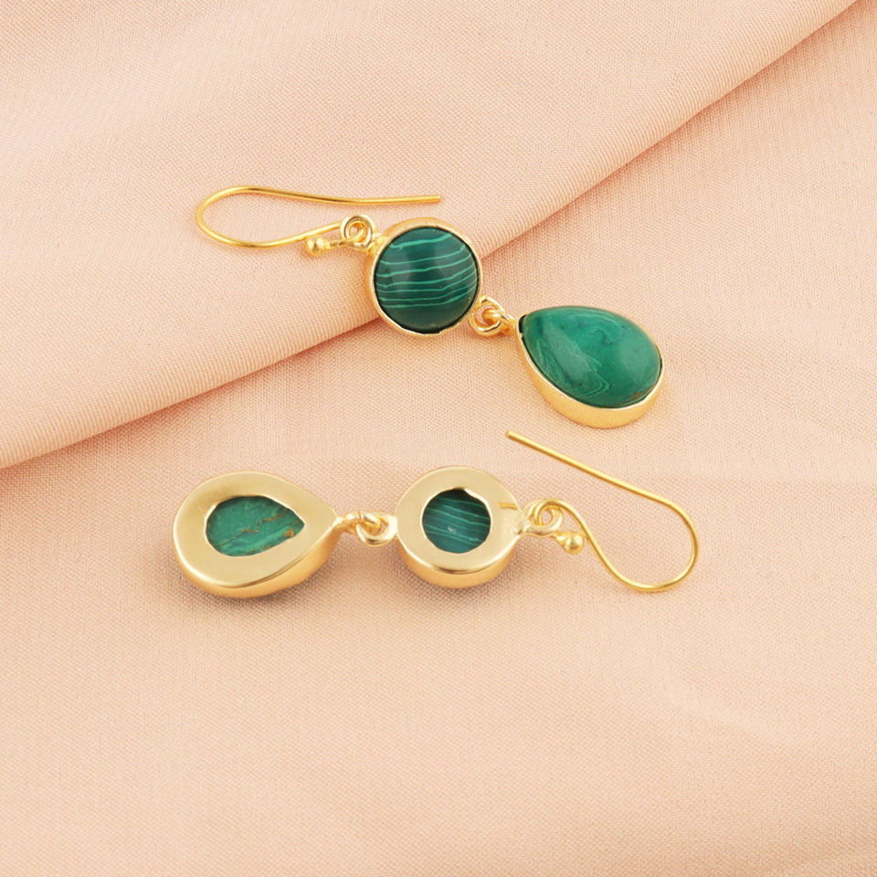 Conception populaire synthétique malachite vert turquoise ronde et poire forme boucle d'oreille en laiton plaqué or pince sett goutte boucles d'oreilles pendantes