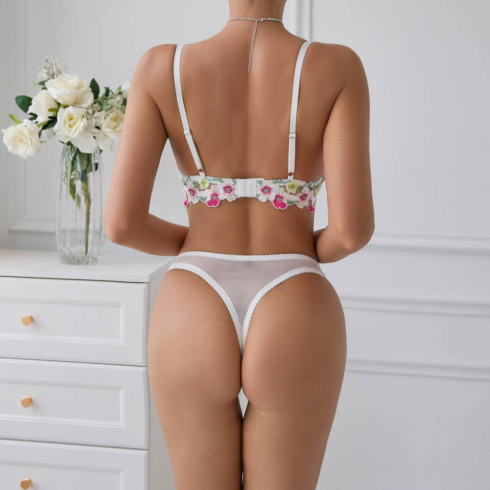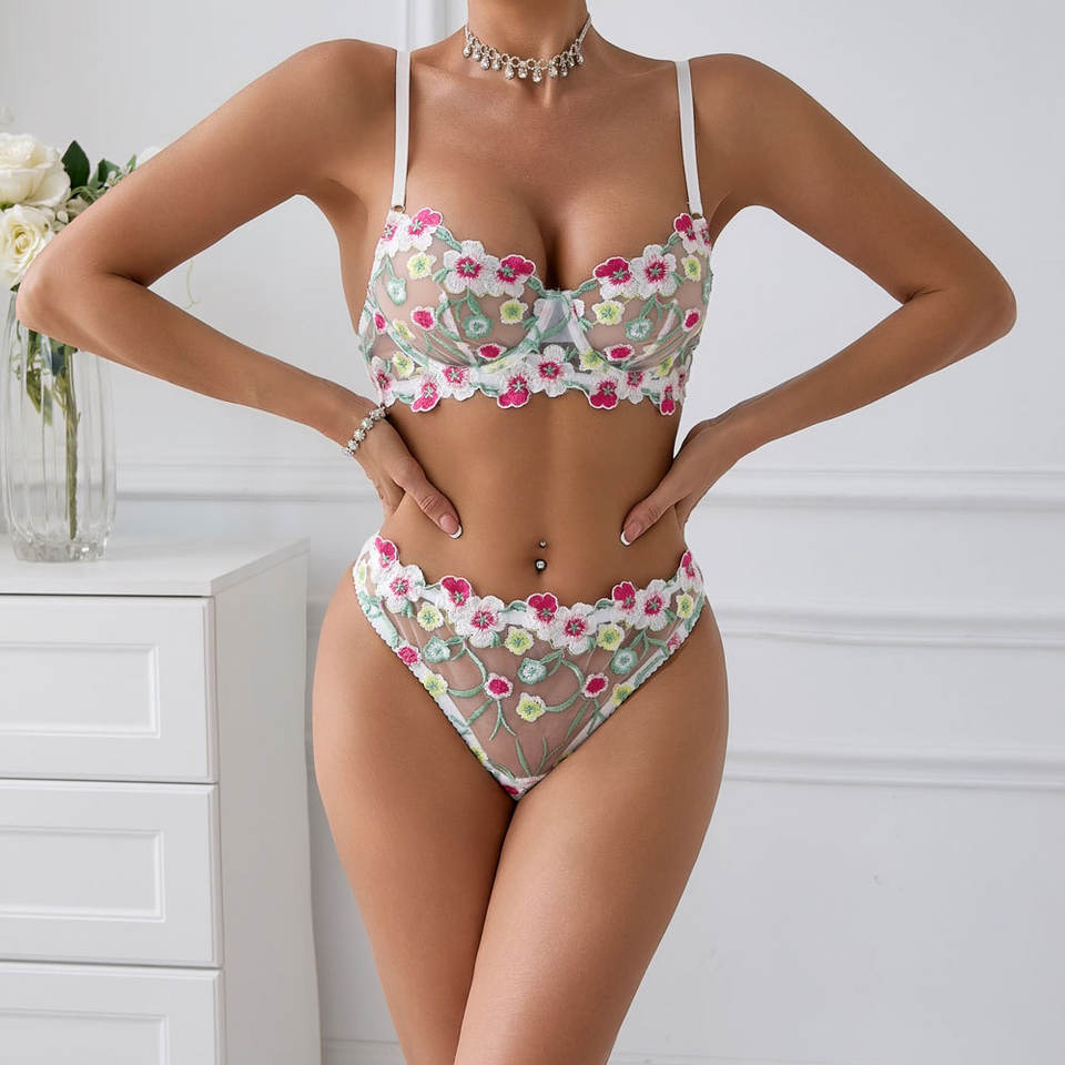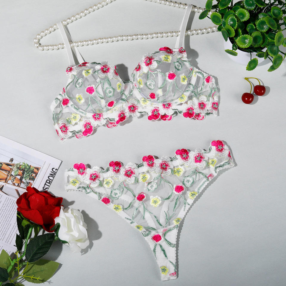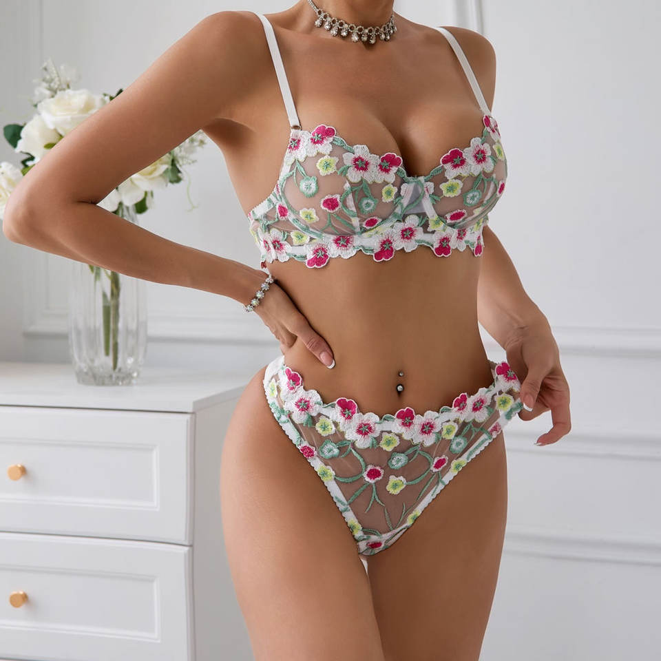Popular FlowersSexy Flower Embroidery Bra Set Transparent Lingerie Lace Hollow Decoration Machine Embroidered Bra Panty