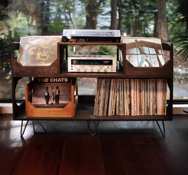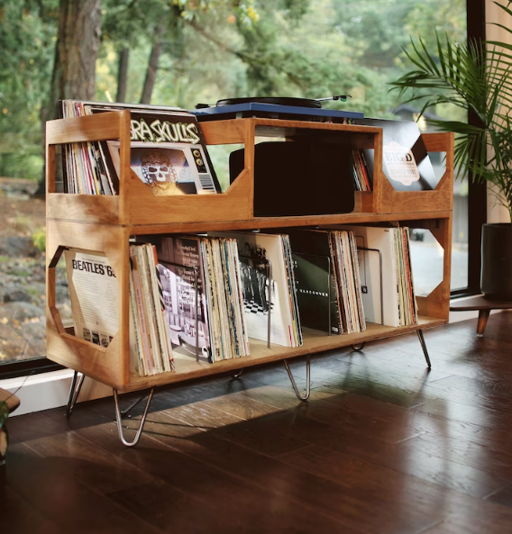Meuble de maison populaire : Support de tourne-disque Irving, style bibliothèque, pour rangement de disques vinyles