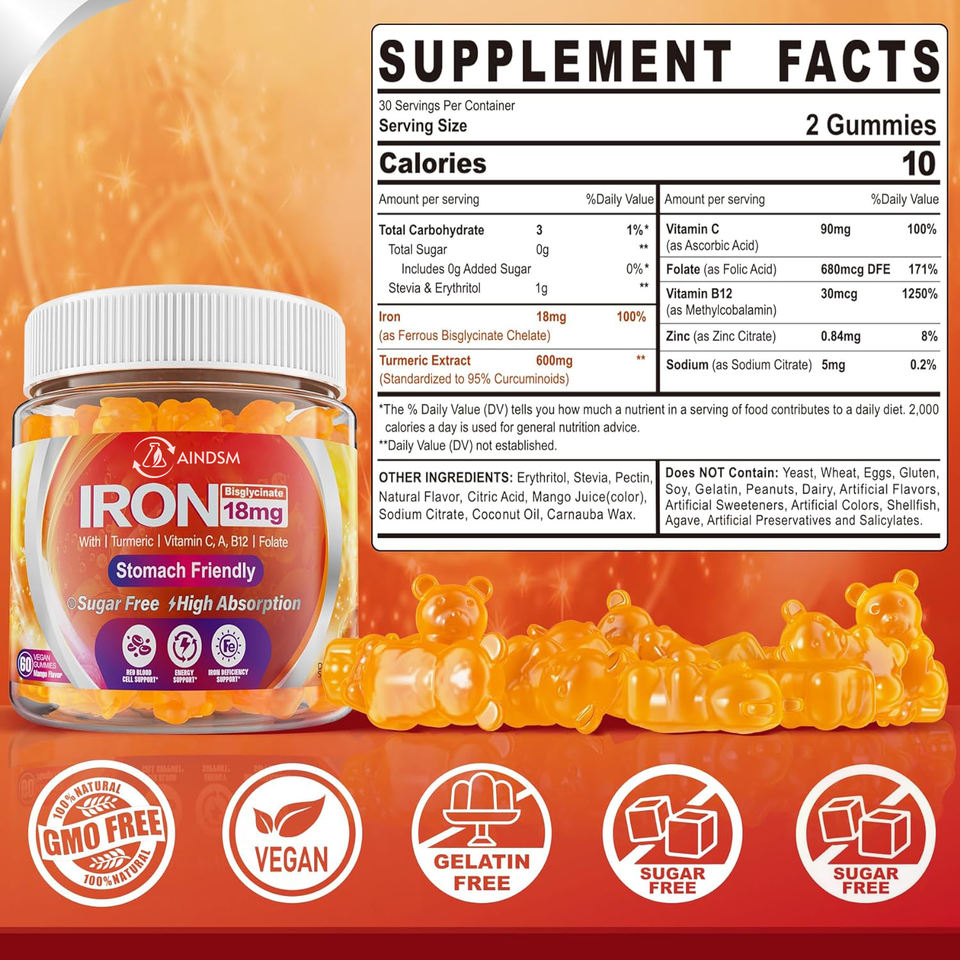 Gummies de fer populaires pour augmenter le niveau d'énergie, gummies de fer bisglycinate, supplément de fer au curcuma