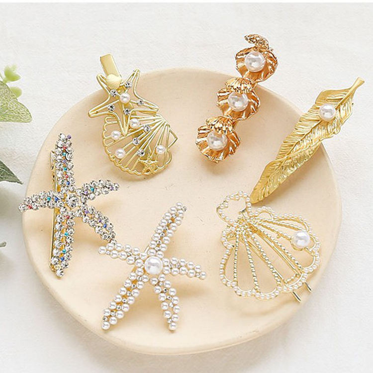 Barrette à cheveux populaire de la série Océan, étoile de mer, coquille, conque, plume, perle, strass, pour filles, épingles à cheveux pour femmes