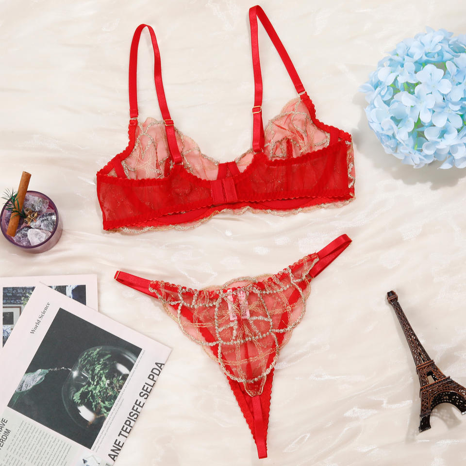 Ensemble de lingerie féminine haut de gamme en dentelle et maille transparente avec décoration en fil doré, style rétro sexy, deux pièces