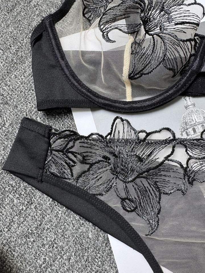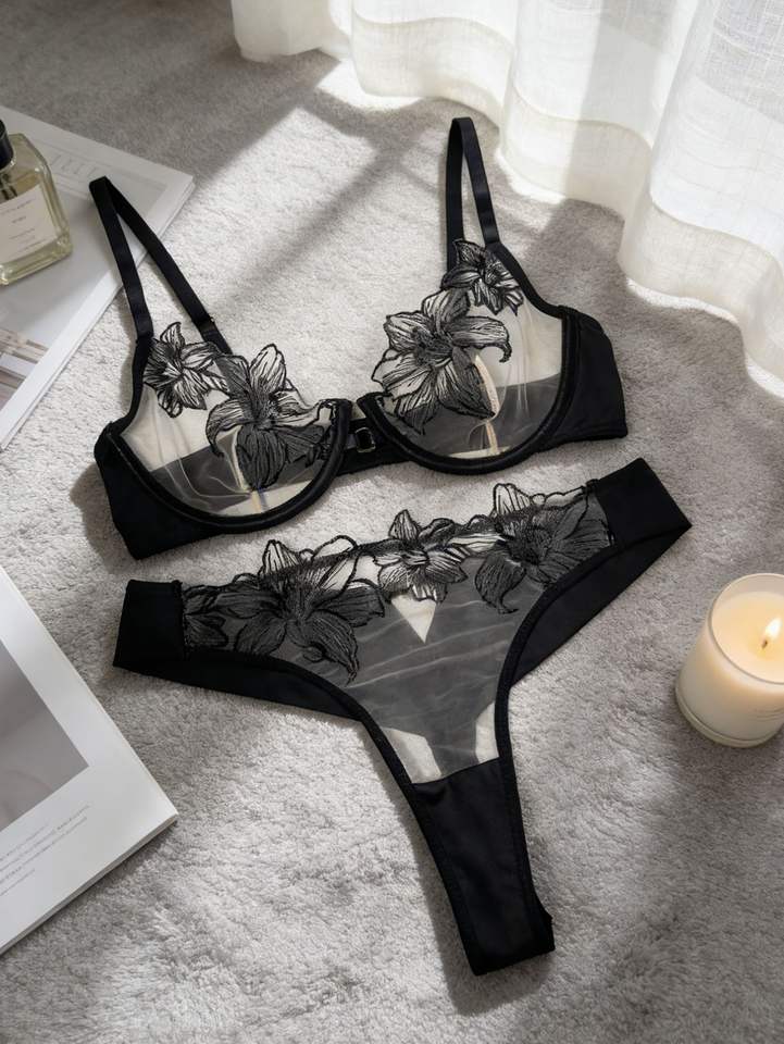 Ensemble de lingerie sexy populaire en maille brodée de fleurs avec soutien-gorge push-up et culotte transparente pour femme