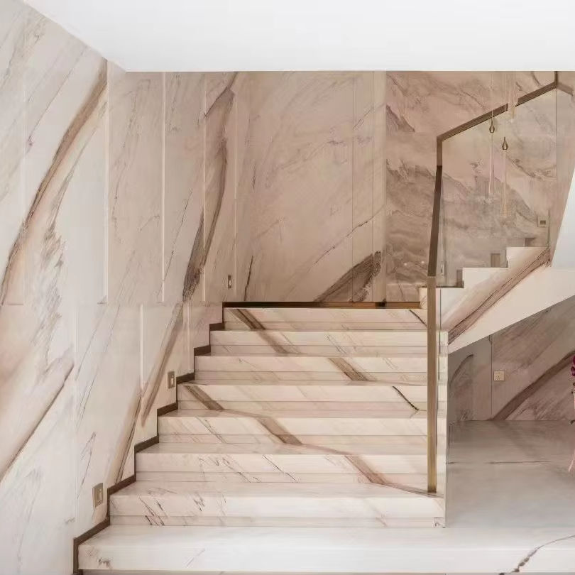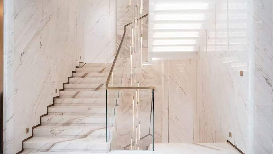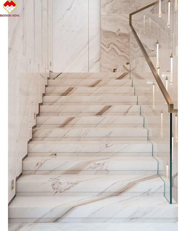 Escalier personnalisé en marbre blanc Palissandro brillant avec éclairage LED, marbre blanc d'Italie avec veines brunes