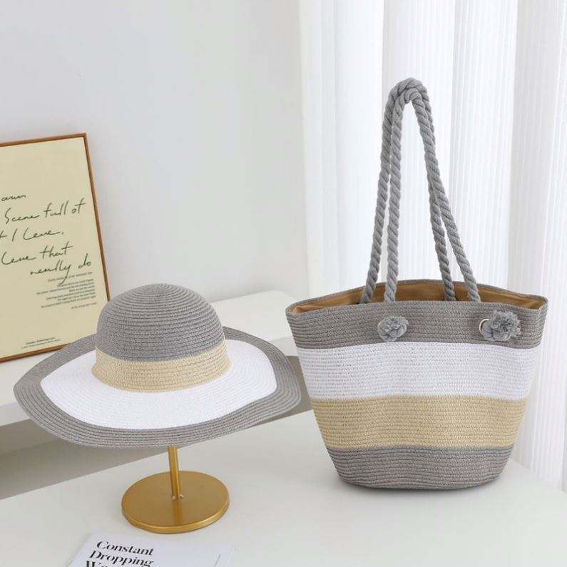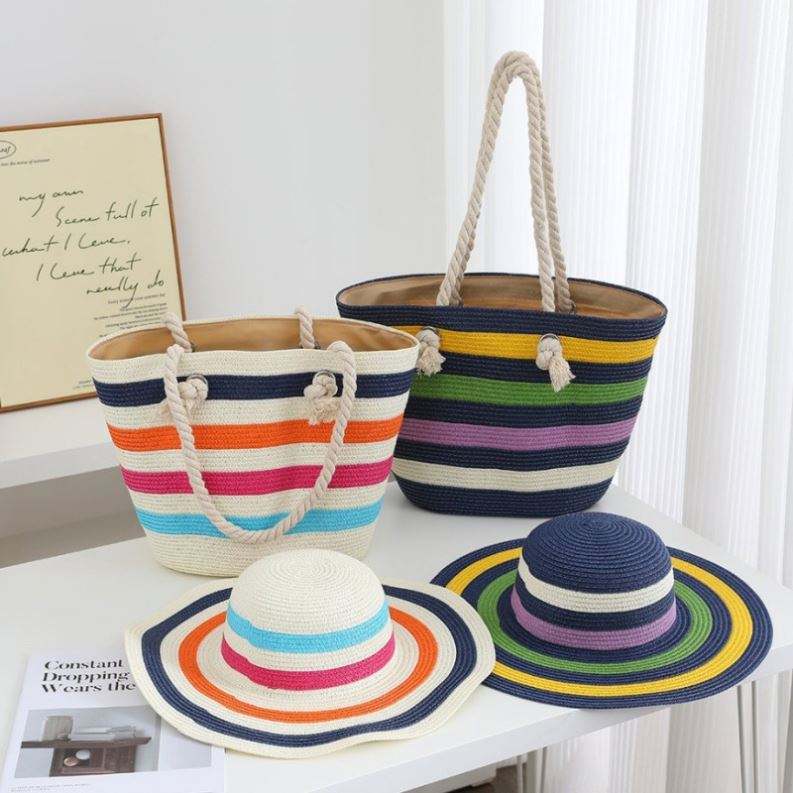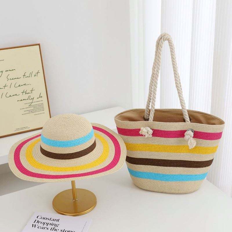Ensemble populaire de sac de plage et chapeau de soleil pour les vacances d'été, 2 pièces, sac fourre-tout en paille à fermeture éclair pour femme, idéal pour l'extérieur