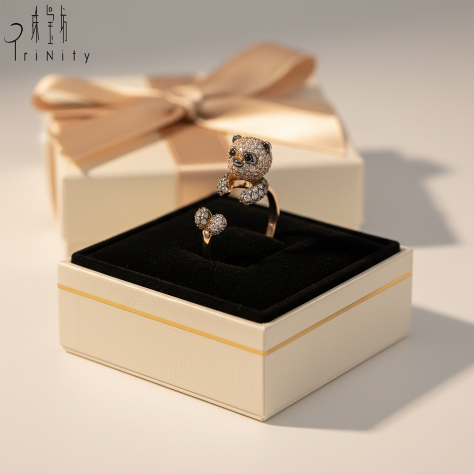 Bague populaire en or massif 18 carats avec diamant naturel véritable brillant, design minimaliste exquis en forme de panda, bijou de vente en gros