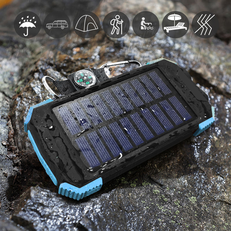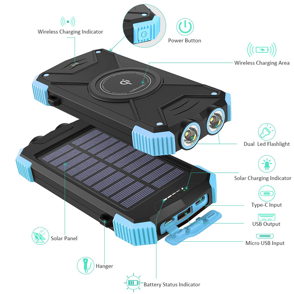 Batterie externe solaire portable 10 000 mAh, étanche, charge rapide 15 W, chargeur sans fil, triple USB, lumière LED, pour les randonneurs et les utilisateurs de téléphones