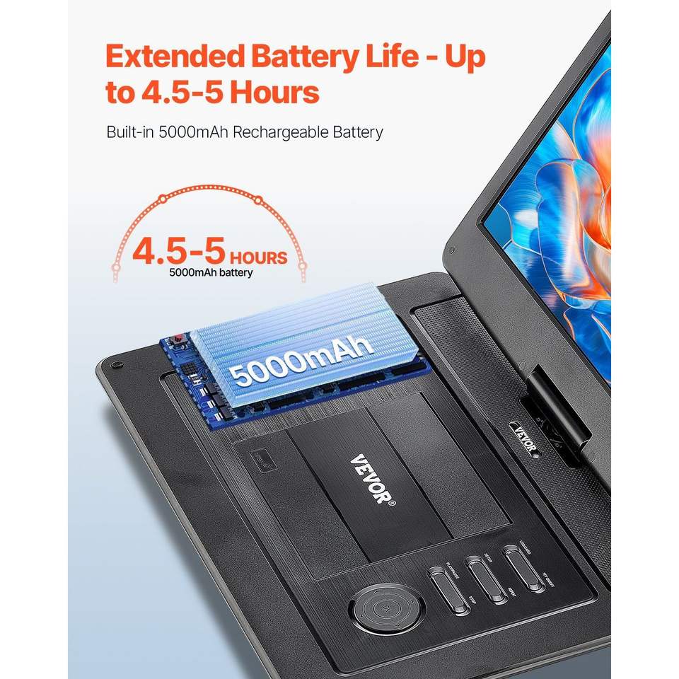 Écran portable HD pivotant de 15,6 pouces pour lecteur DVD avec batterie rechargeable intégrée de 4,5 à 5 heures, double haut-parleur et prise en charge de la synchronisation