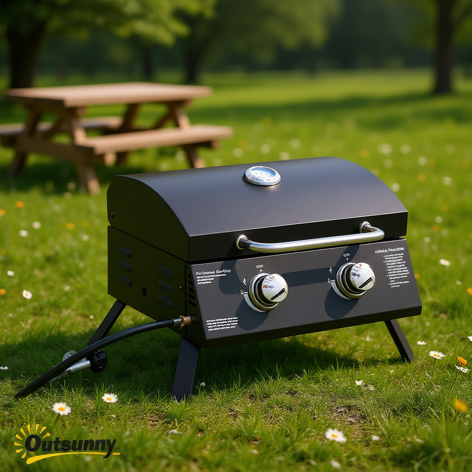 Barbecue au gaz propane portable Outsunny à 2 brûleurs avec thermomètre intégré pour le camping, noir