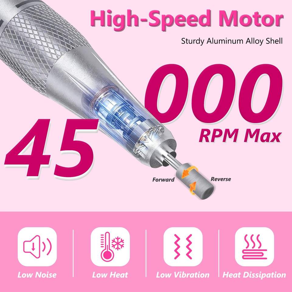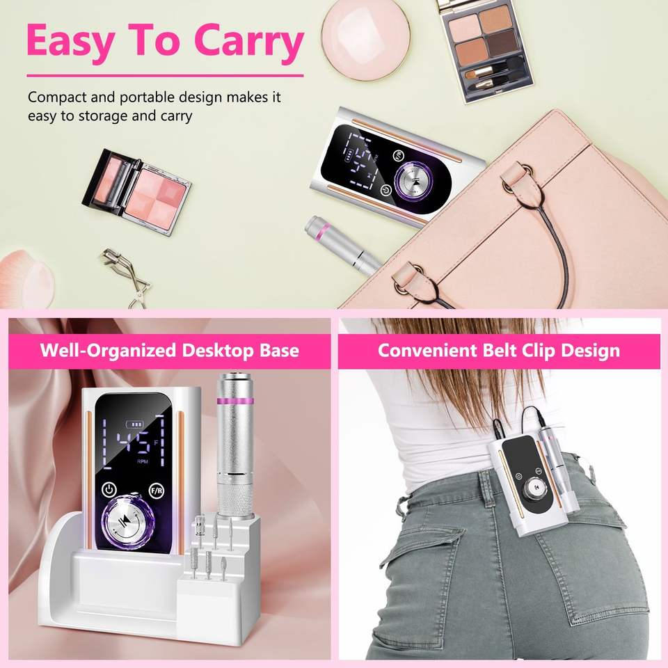 Ponceuse à ongles électrique portable 45 000 tr/min avec 11 embouts, base et clip de fixation, sans fil, rechargeable, professionnelle