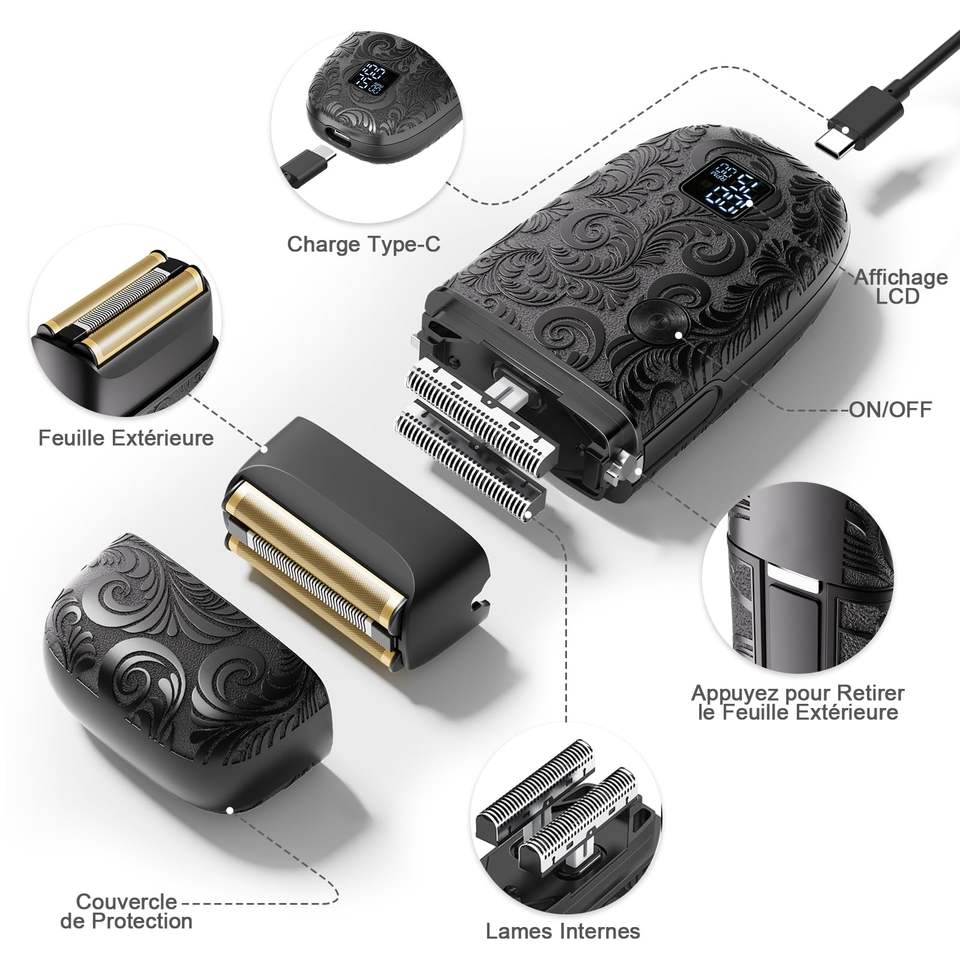Rasoir Électrique Portable Sans Fil pour Hommes IPX7, Triple Lame, Utilisation Humide/Sèche, Rechargeable et Lavable