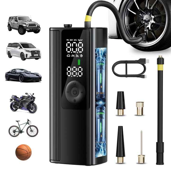 Gonfleur de pneus portable sans fil en ABS 150 PSI avec écran LED, rechargeable par USB, gonflage rapide, lampe de poche pour voiture, moto, vélo, ballon