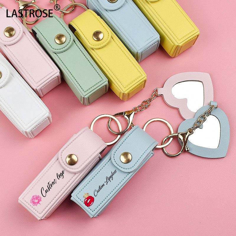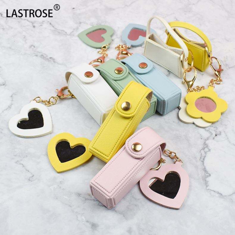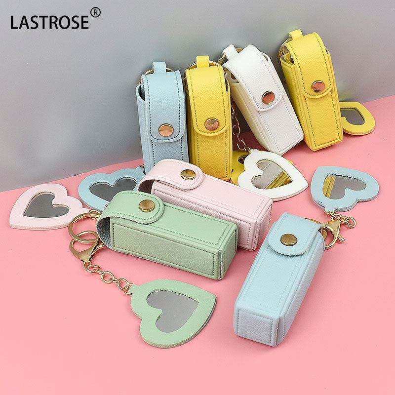 Étui à rouge à lèvres portable en cuir avec mini miroir de maquillage en forme de cœur, porte-clés, pochette pour gloss et baume à lèvres pour le voyage