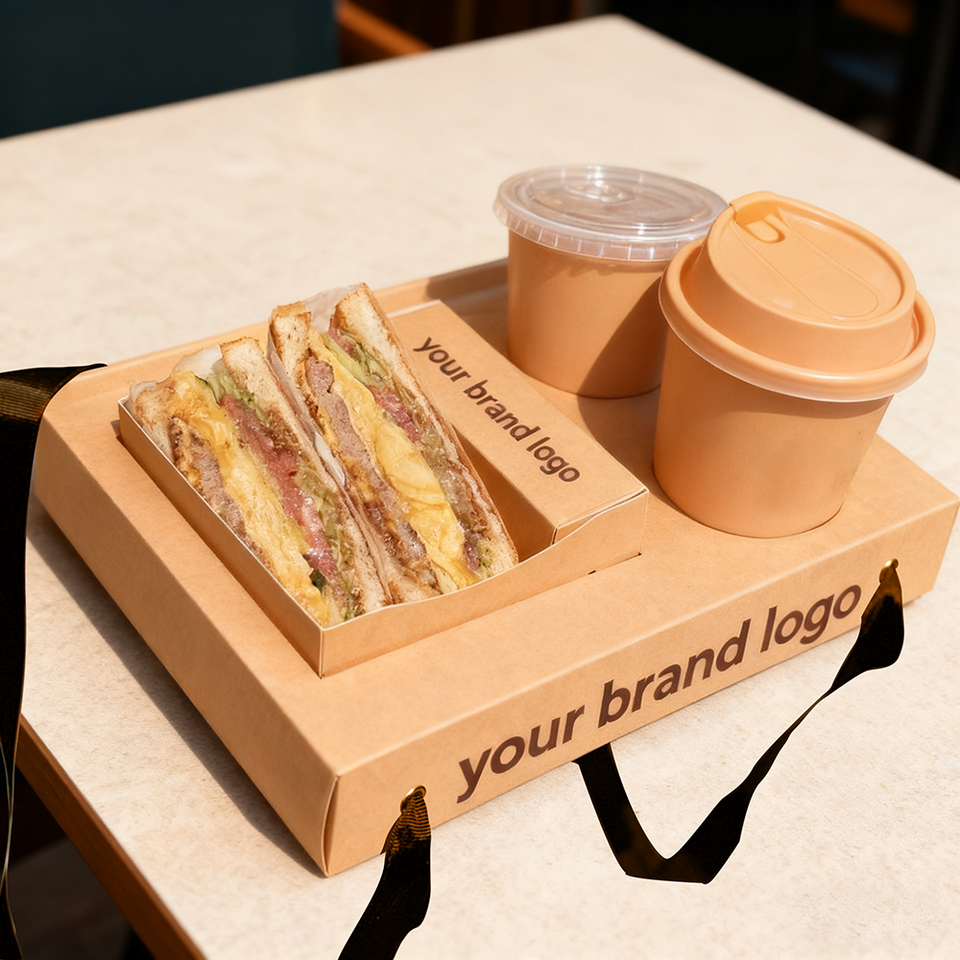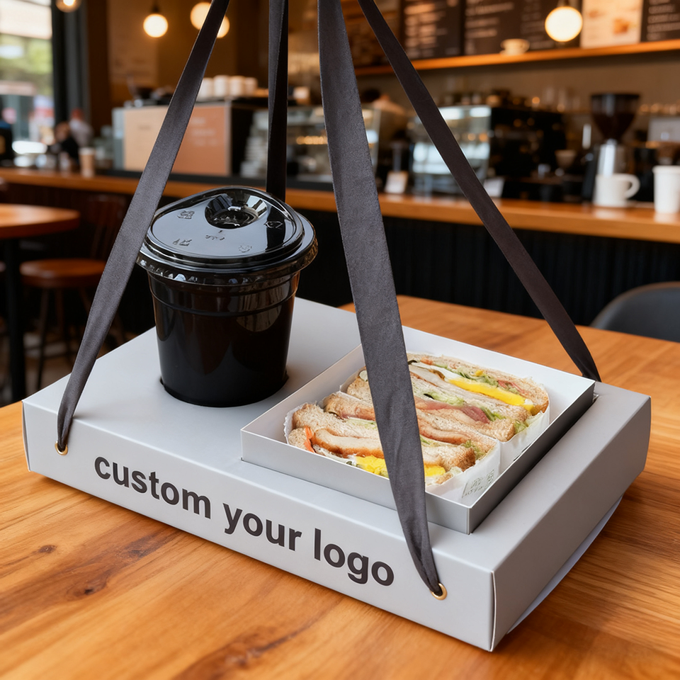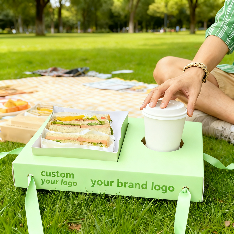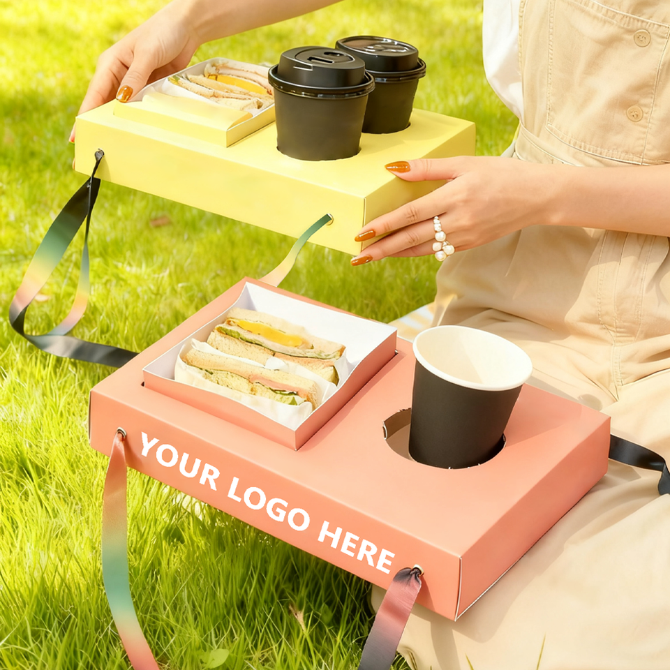 Boîte à lunch portable avec porte-gobelet intégré, plateau en papier personnalisé pour sandwichs, toasts et boissons, à tenir à la main