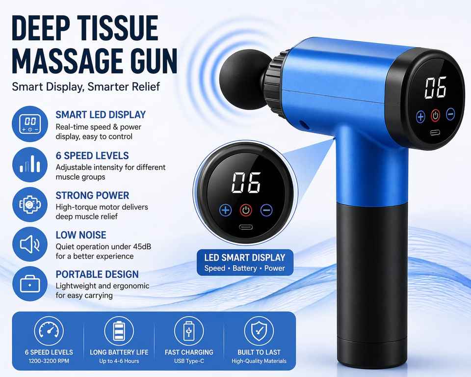 Pistolet de massage portable avec écran LED, masseur à percussion pour tissus profonds, appareil de récupération musculaire, 6 niveaux de vitesse, fournisseur OEM en gros
