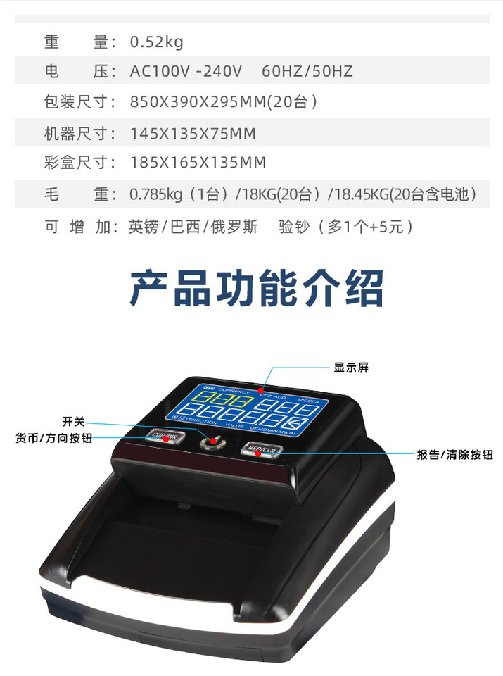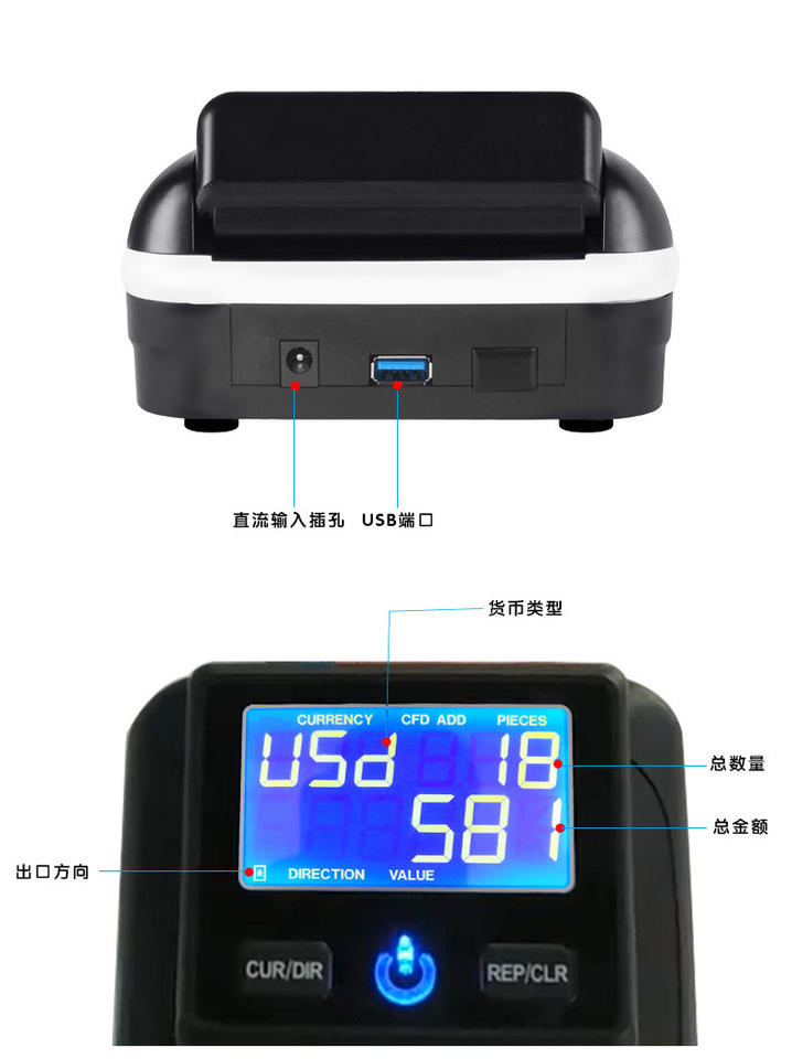 Compteur de billets portable multi-devises en métal avec détection de 40 devises et comptage de la valeur des billets mixtes | Analyseur de billets de banque à écran LED USD