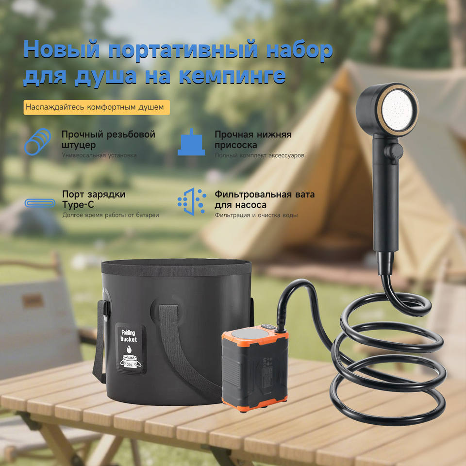Pommeau de douche portable d'extérieur alimenté par batterie, 5 vitesses de pulvérisation, pour le camping et les chantiers