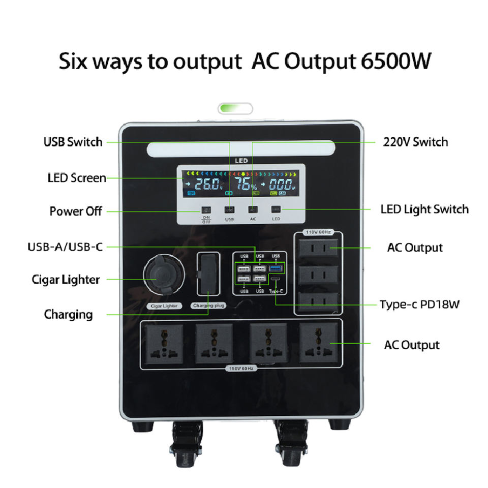 Station d'alimentation portable 3000W/6500W avec panneau solaire Lifepo4, batterie externe, lampe torche, compresseur d'air, démarreur de saut - Modèle EB70