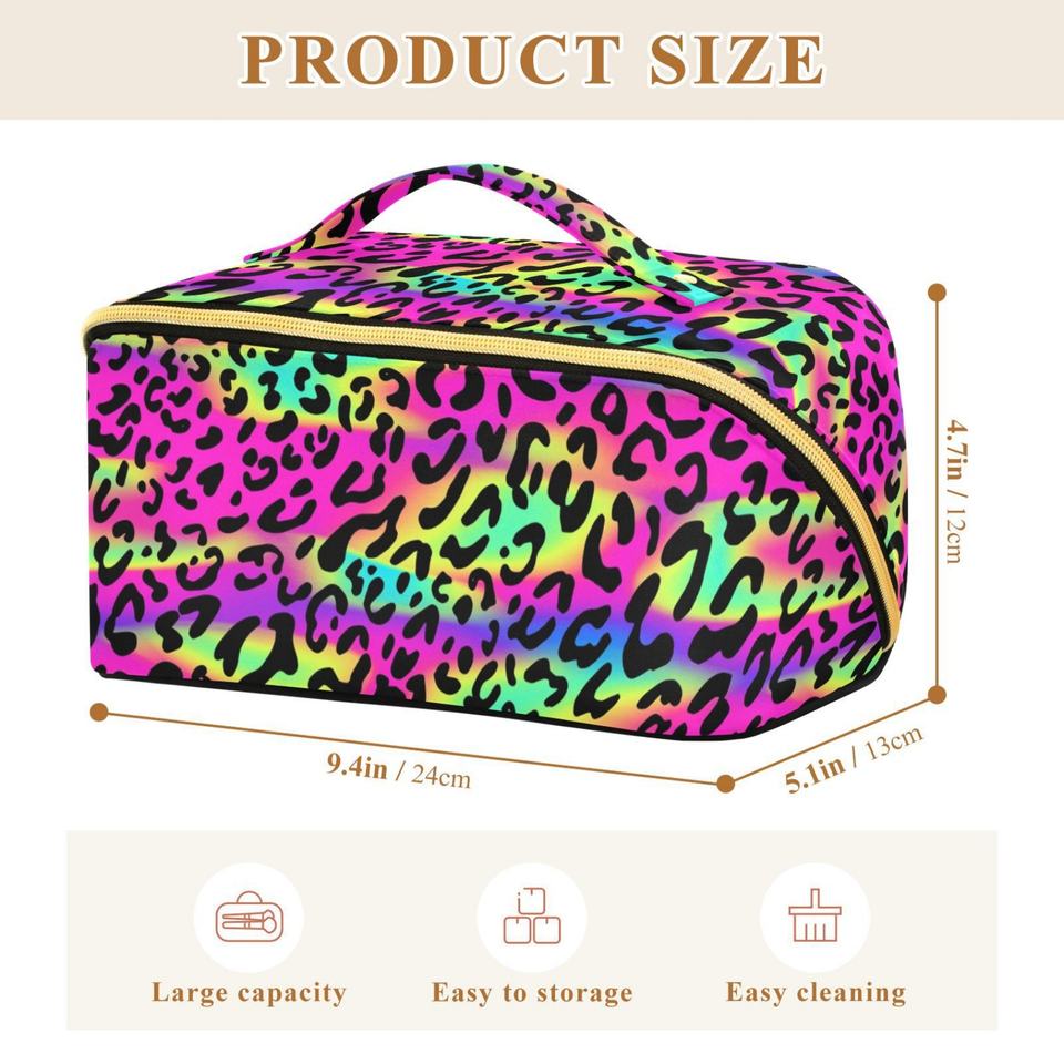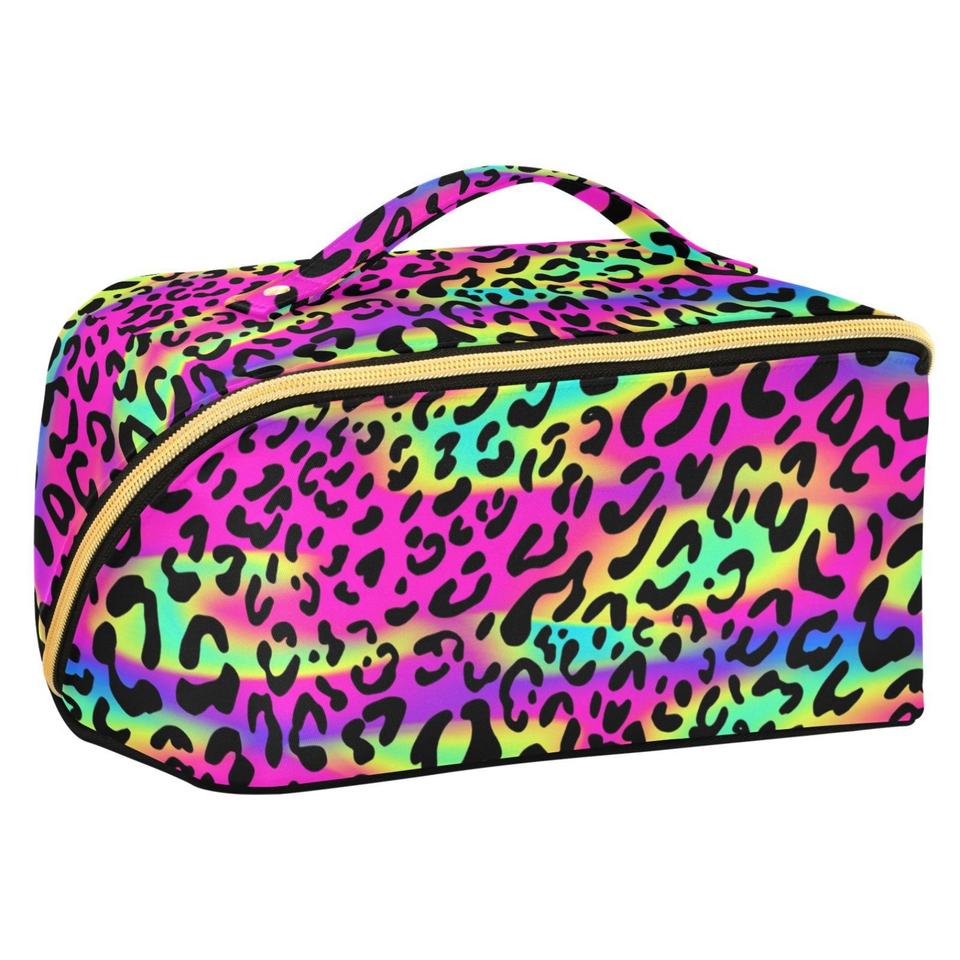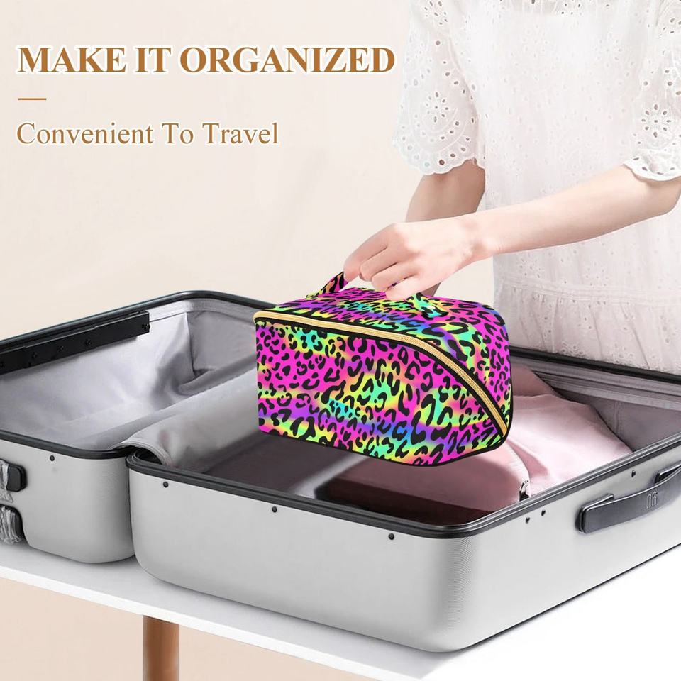 Pochette de toilette portable avec logo personnalisé, design guépard arc-en-ciel, imperméable, sac à cosmétiques de voyage, sac à pinceaux de maquillage avec fermeture éclair dorée