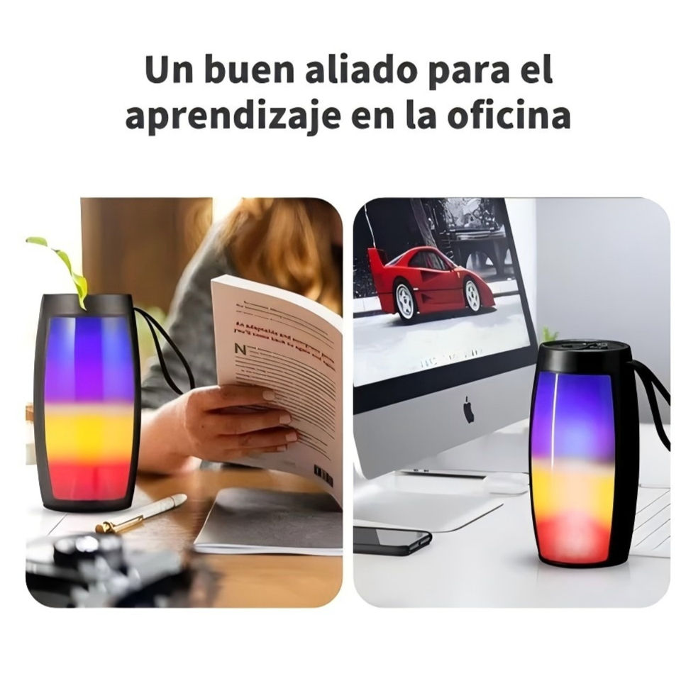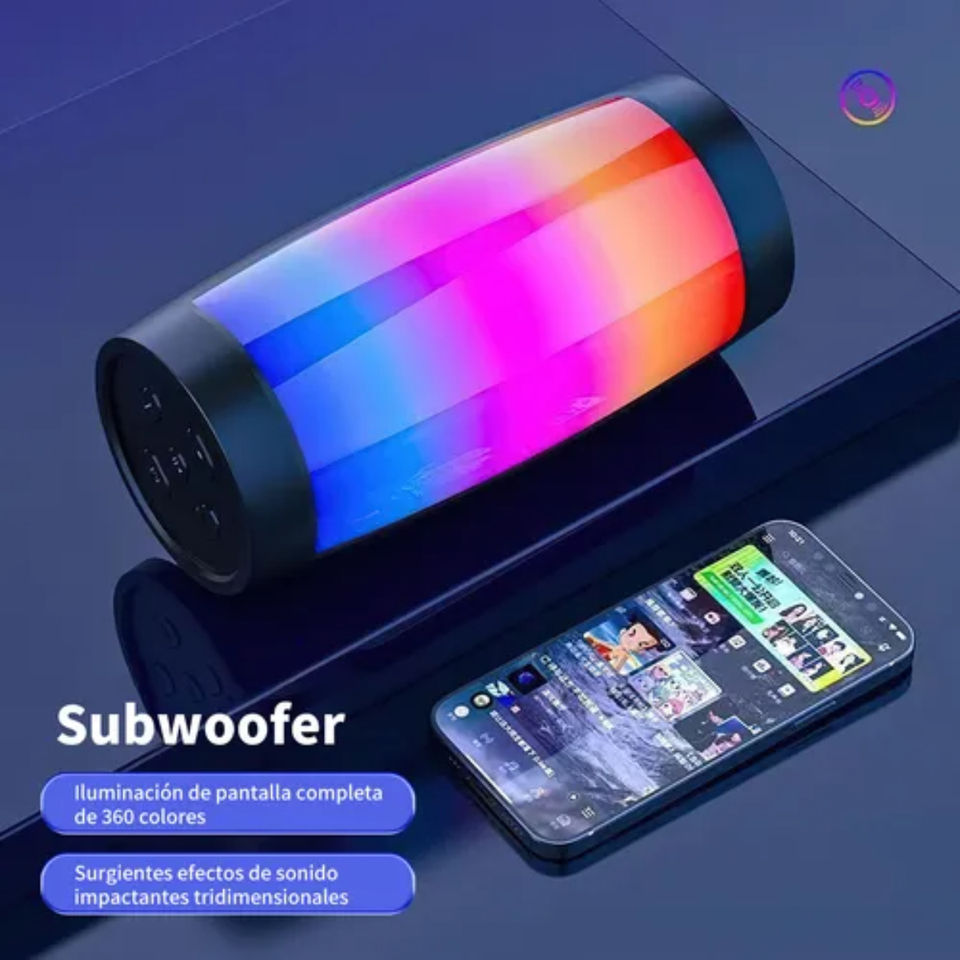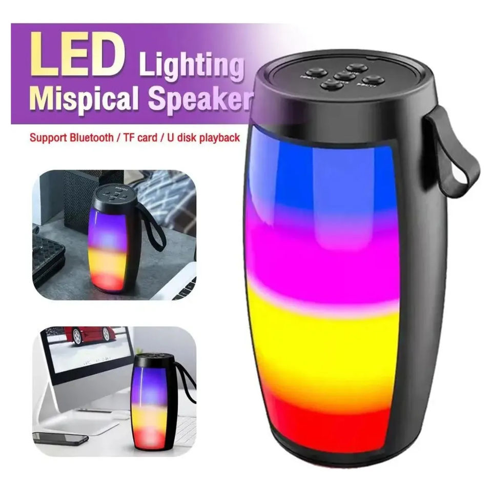 Haut-parleur portable rechargeable avec design TWS, lumières LED et boutons de contrôle intégrés. Idéal