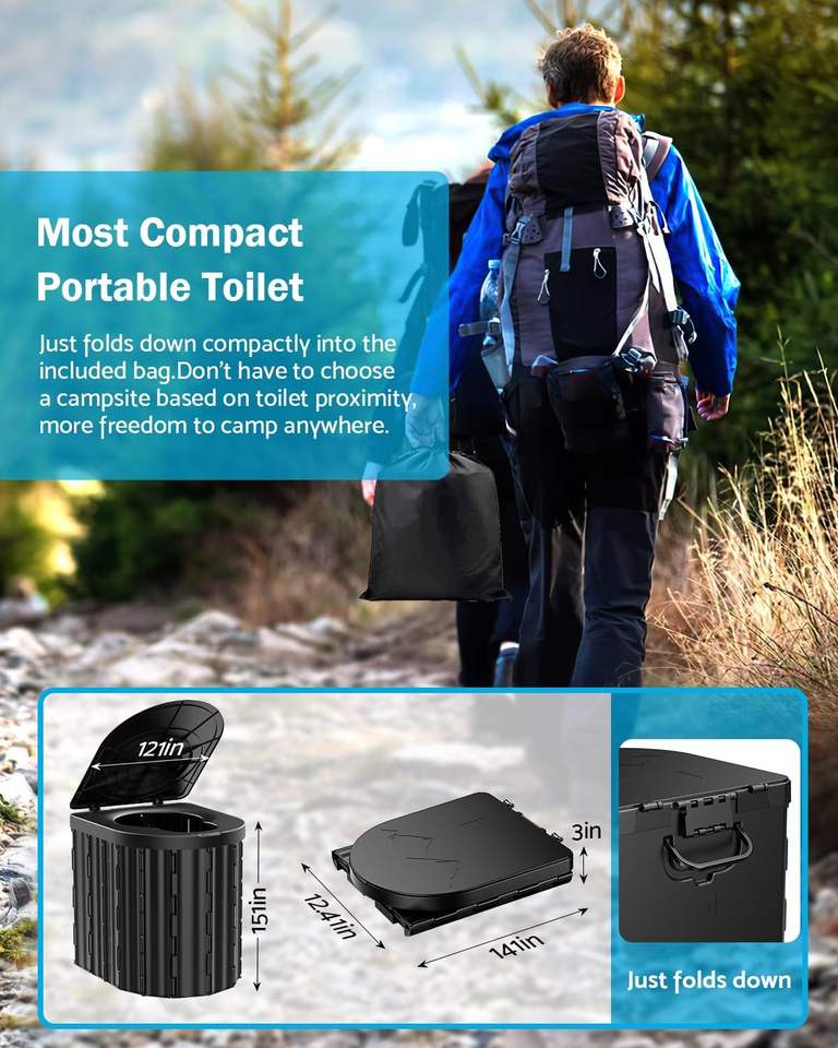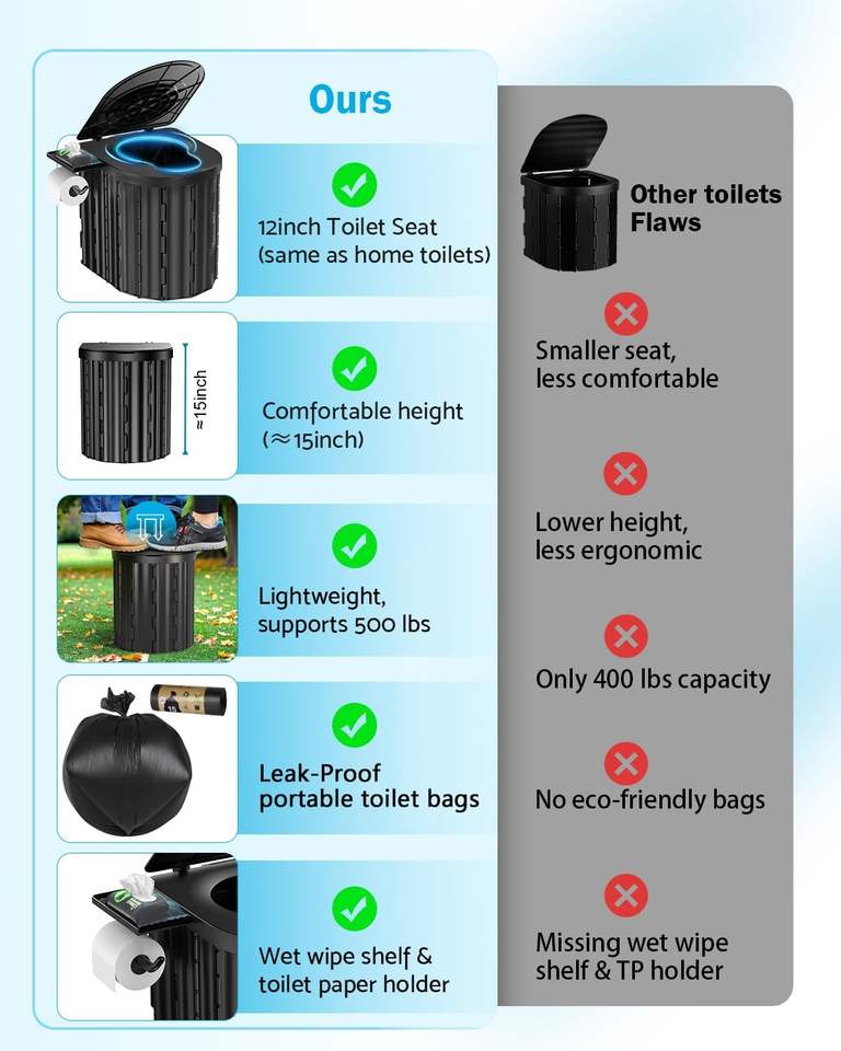 Toilette portable 15\" avec porte-papier amovible amélioré, capacité de charge de 450 lb, 3 mm pour le camping, les voyages en voiture, les camping-cars, les tentes, la plage, les camions