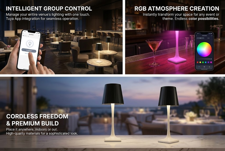 Lampe de table sans fil portable Tuya Wifi App RGB à intensité variable, rechargeable, avec minuterie, pour restaurant et bar