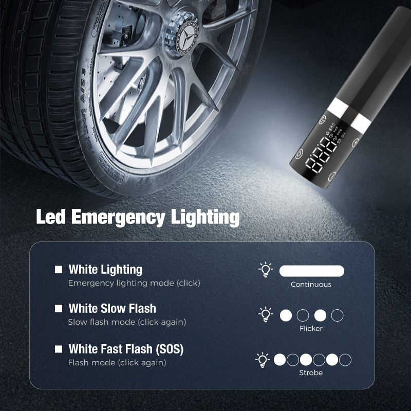 Automatic Shut Off, Portable, fast inflate, Tire Pressure Monitor, Emergency LightFunction