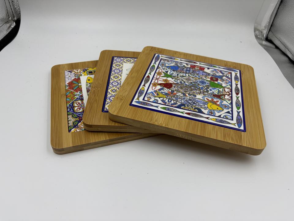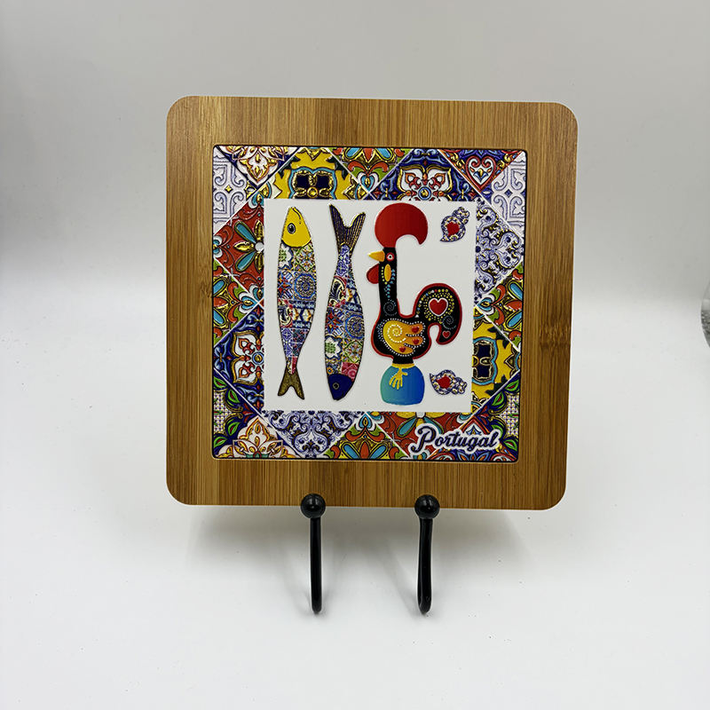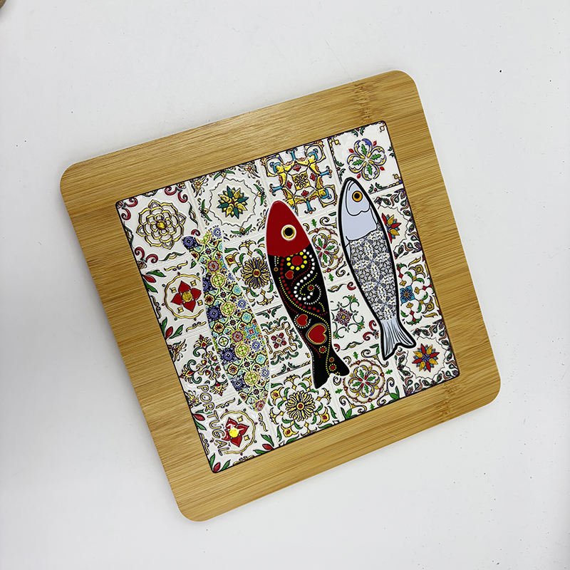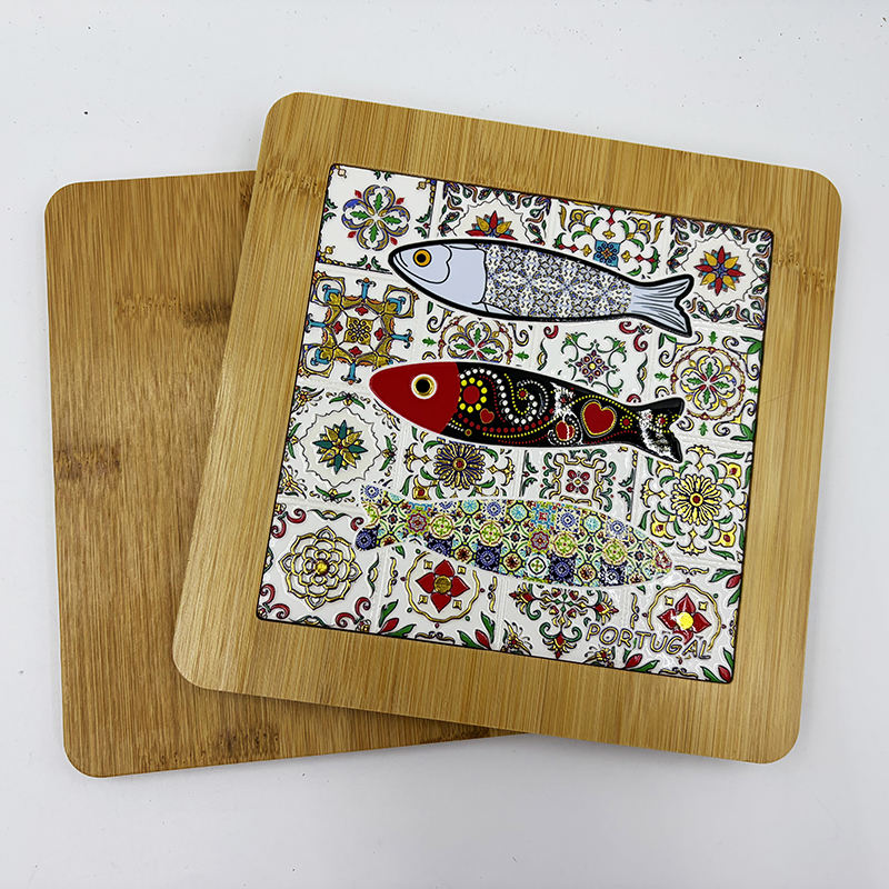 Sous-plat en céramique de style porto-léonais avec cadre en bambou et support en bois, tapis de table en carreaux portugais pour la maison et la cuisine