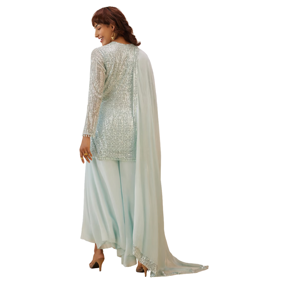 Ensemble de costume palazzo bleu poudre en paillettes vente en gros de vêtements ethniques OEM pour femmes fournisseur d'usine tenue de fête de mariage personnalisée