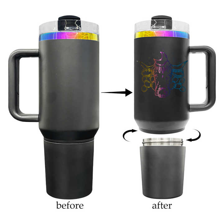 Bouteille d'eau isotherme 40 oz H2.0 avec revêtement en poudre arc-en-ciel, base cachée à visser, compartiment secret pour collations