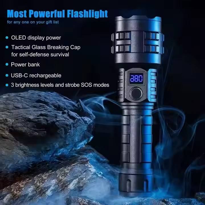 Lampe torche LED puissante à haut lumen, super brillante, rechargeable, portable, ultra puissante, lampe torche USB C, utilisation en extérieur en cas d'urgence