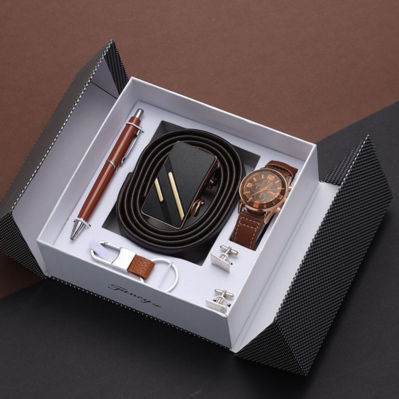 Coffret cadeau d'affaires pratique, pour les partenaires commerciaux d'un coffret cadeau haut de gamme Montre + Ceinture + Porte-clés + Boutons de manchette + Coffret cadeau stylo