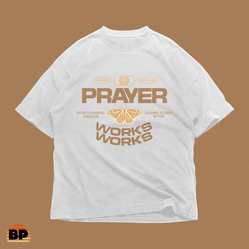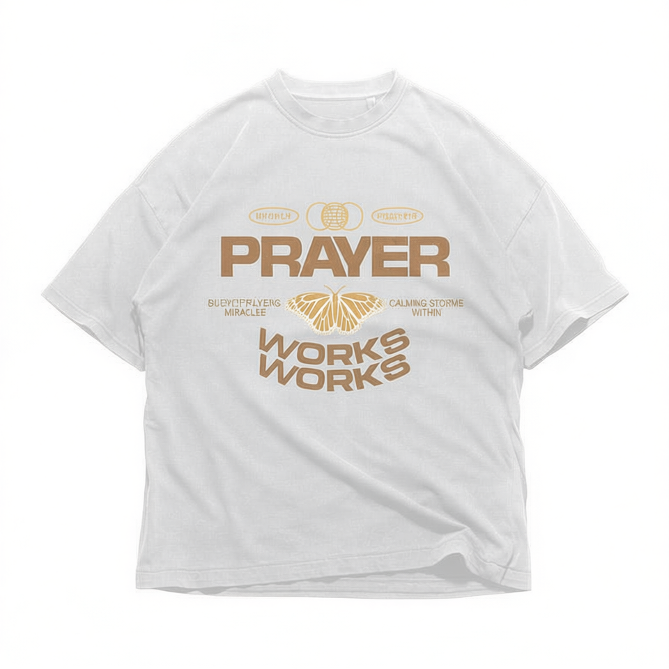T-shirt graphique Faith Butterfly Tee Prayer Works, streetwear spirituel, coupe oversize, unisexe, esthétique vintage, imprimé beige neutre