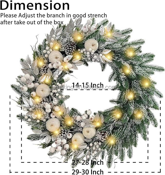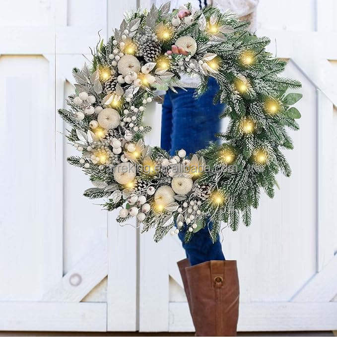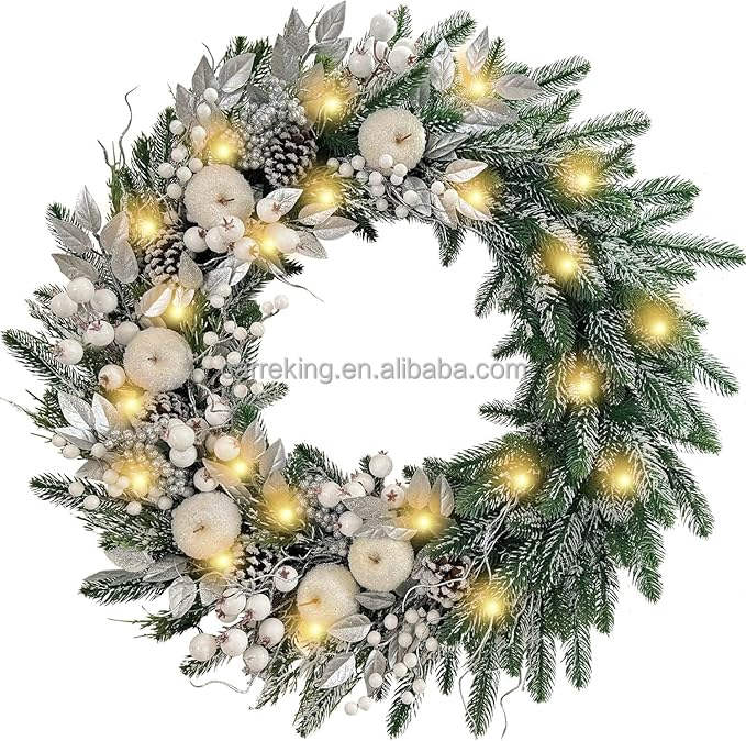 Grande guirlande de Noël pré-éclairée de 30 pouces avec pommes blanches et baies pour porte d'entrée Porte de Noël éclairée en blanc argenté