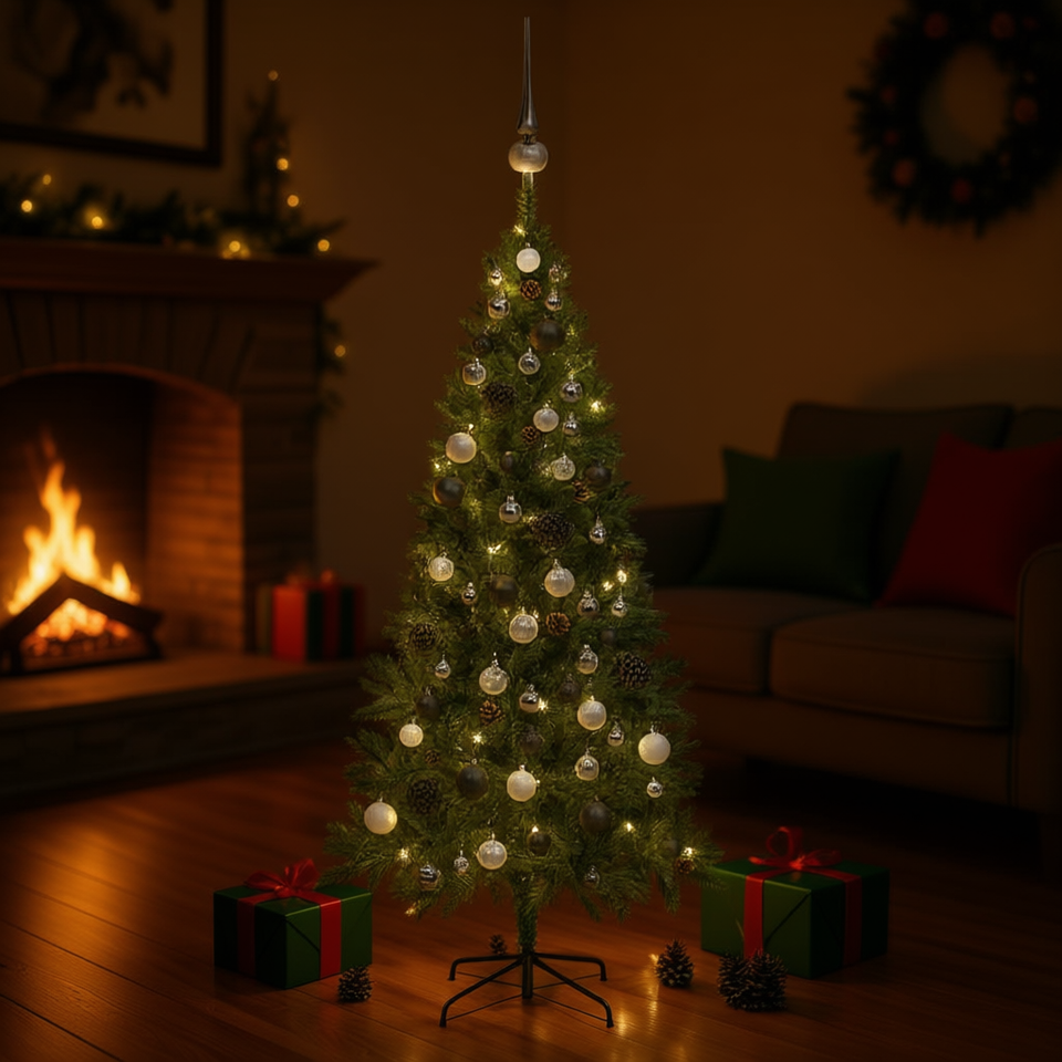 Sapin de Noël artificiel pré-éclairé de 70,9 pouces avec cônes de pin, lumières LED blanc chaud, décoration intérieure, base vert-grise sur pied