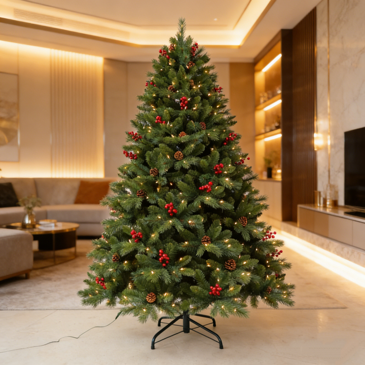 Sapin de Noël artificiel pré-éclairé avec des cônes de pin et des baies rouges pour la décoration de la maison, du bureau et des fêtes, plusieurs tailles