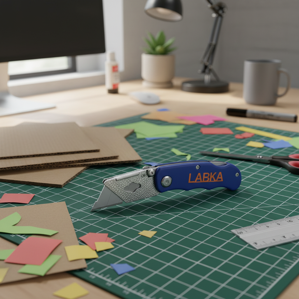 Couteau utilitaire Labka, manche en plastique bleu, lame en acier inoxydable, outil de coupe rétractable, usage de bureau
