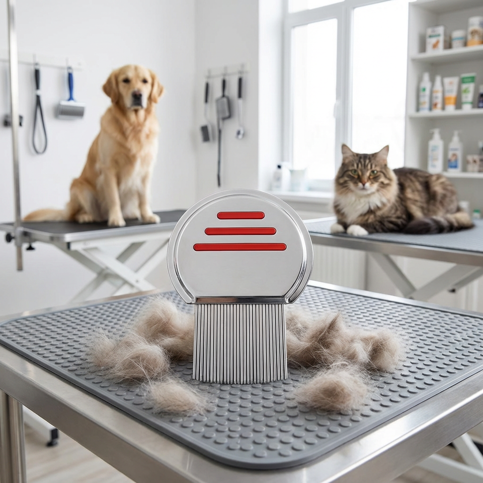 Peigne à poux de précision en acier inoxydable à dents fines et barres antidérapantes en silicone rouge, facile à utiliser pour chats et chiens