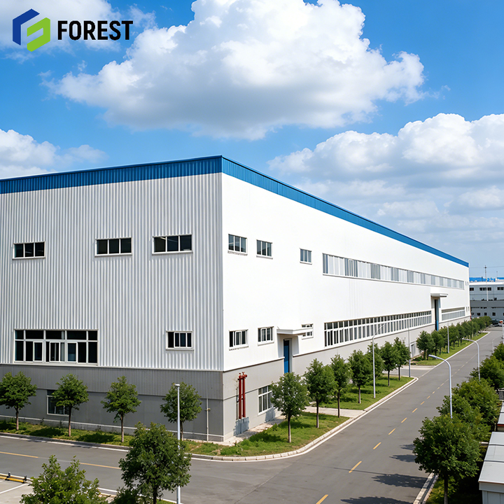Centre logistique préfabriqué standardisé à longue portée en structure acier robuste pour atelier, hôpital et immeuble de bureaux